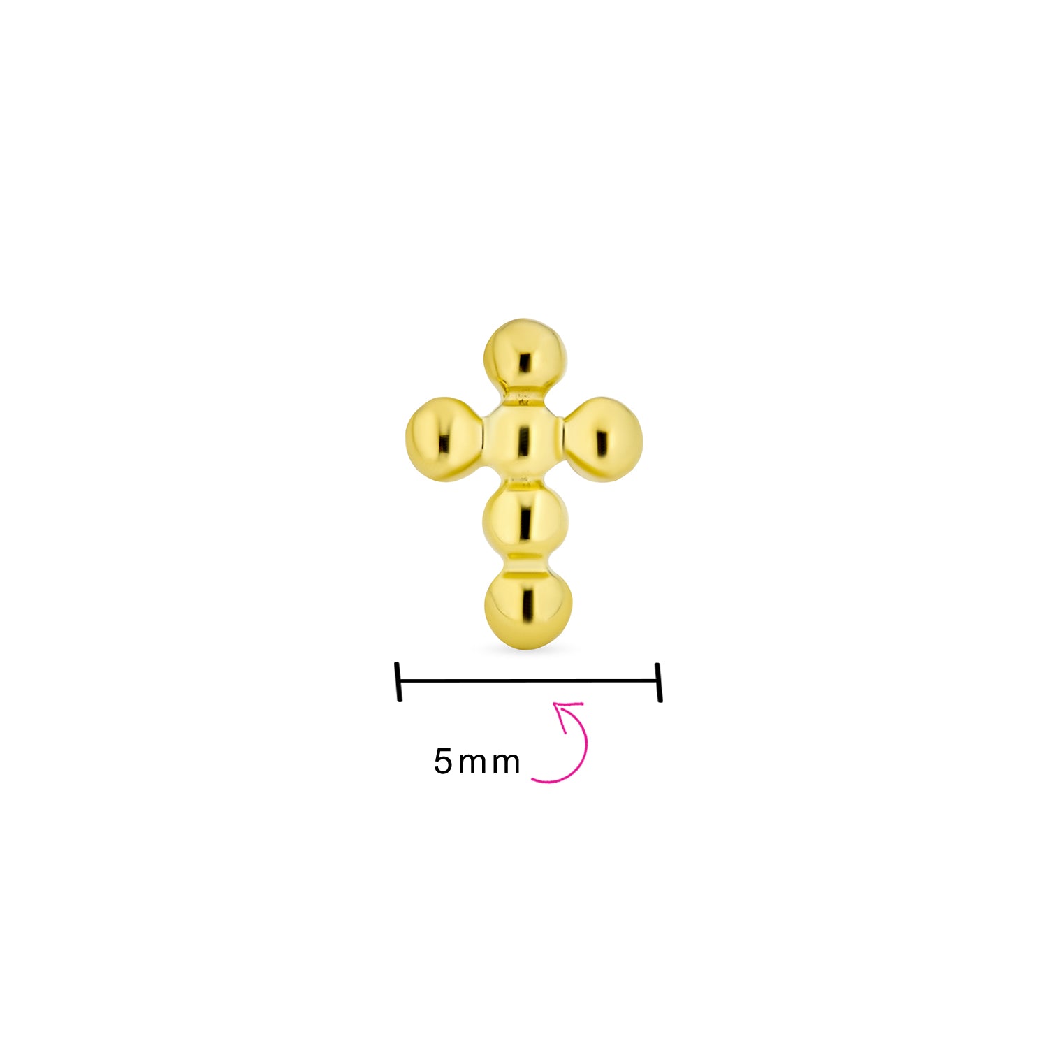- These 14k gold cross motif stud earrings are perfect for daily wear. Featuring a bubble texture and lustrous finish, these delightful cross studs with screw back earrings and short posts are safe and comfortable for your little one's ears.