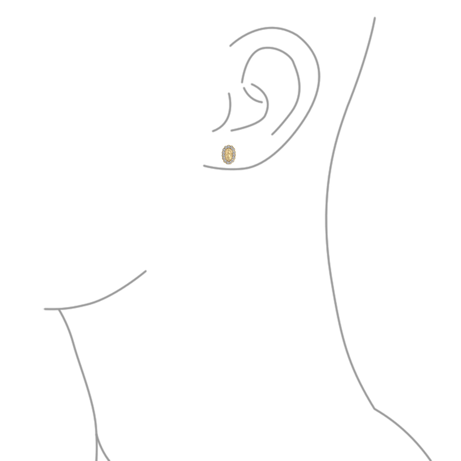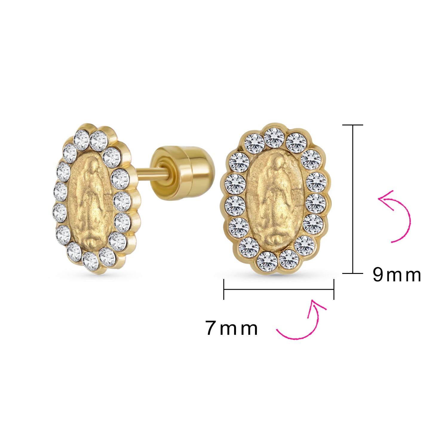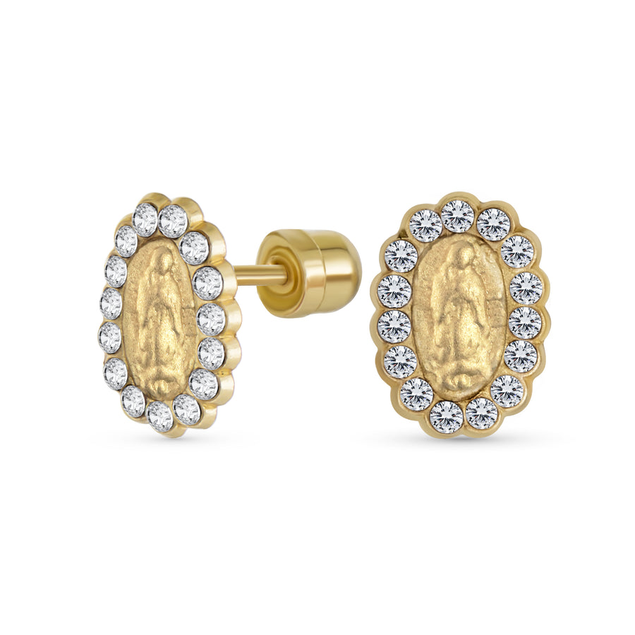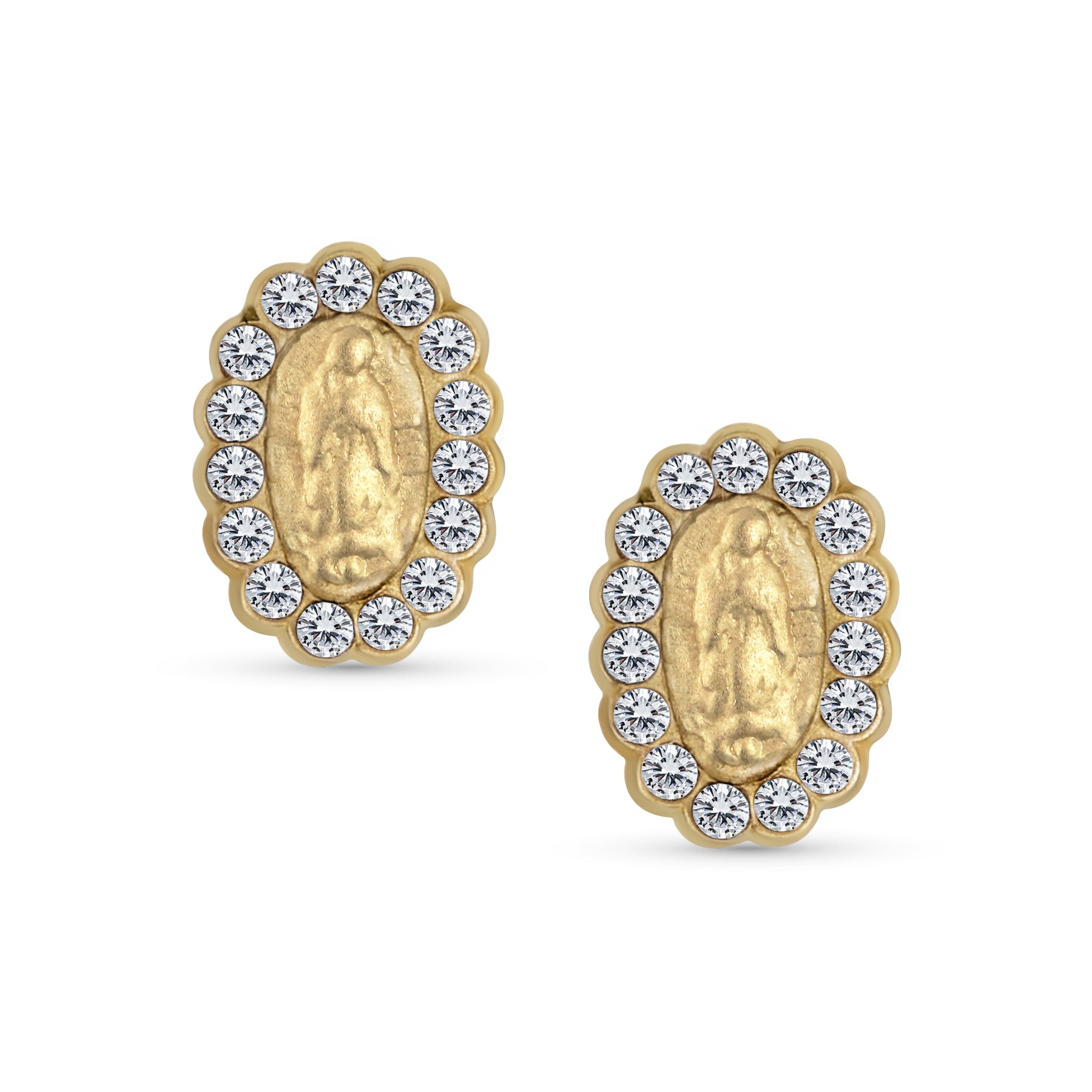- Searching for the perfect Virgin Mary jewelry gift? Discover our stunning 14k gold religious earrings, ideal for any devout individual. These delicate earrings feature an oval depiction of the blessed Virgin Mary. Adorned with 1mm cubic zirconia accents, they offer a beautiful hint of glimmer. Perfect as gold Christian gifts, Christening gifts, or Christmas jewelry. Each earring includes a safety screw back for comfort and security.