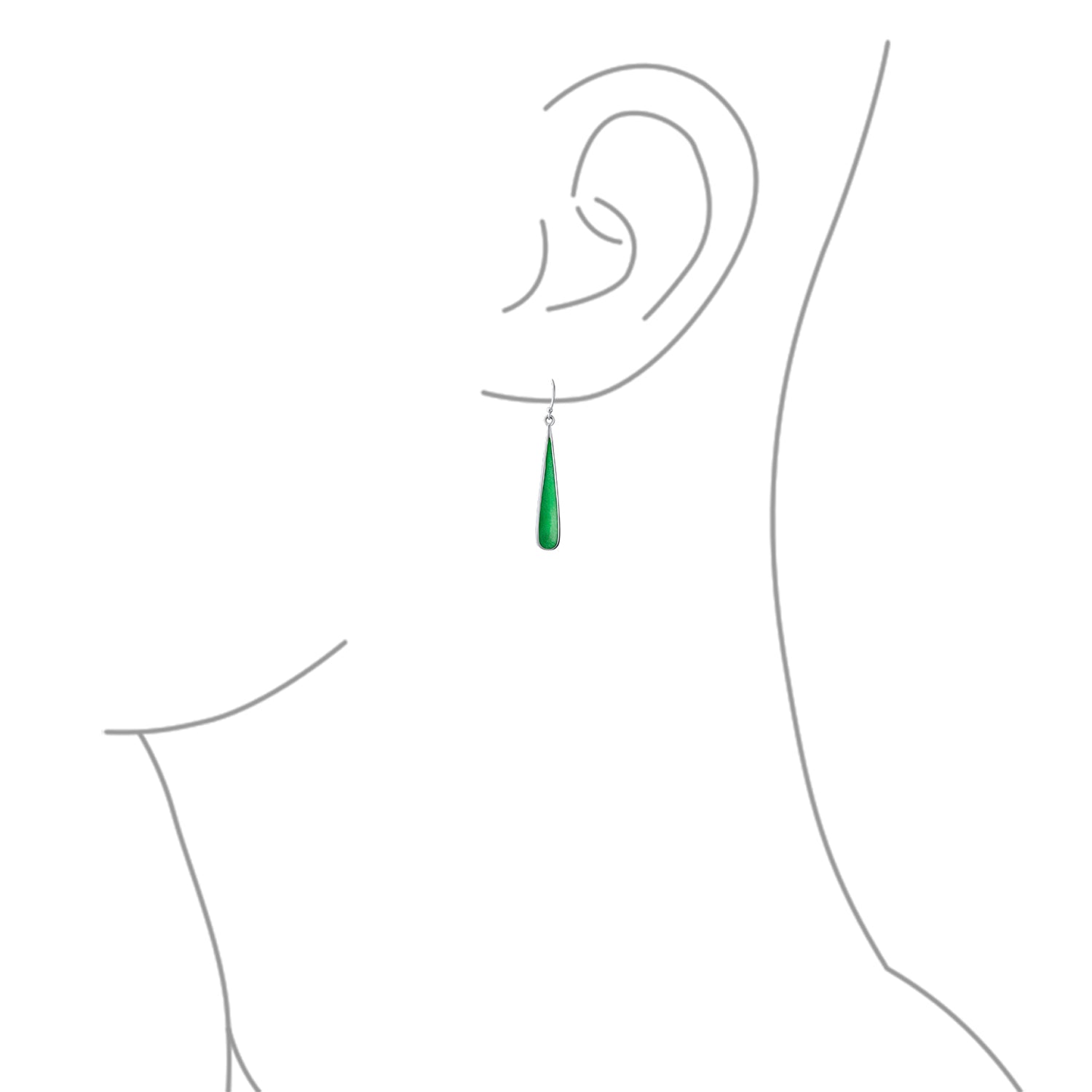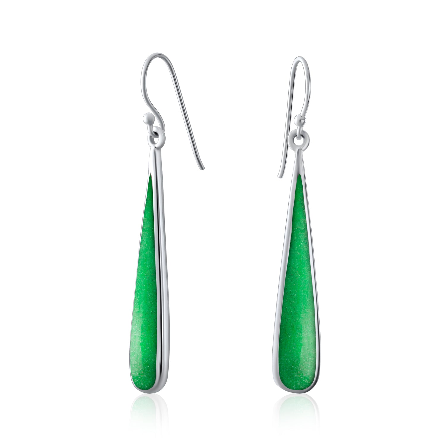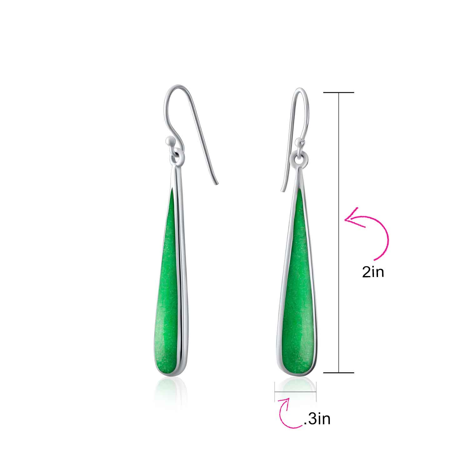 Simple Green Agate Stabilized Turquoise Inlay Long Teardrop Dangle Earrings .925 Sterling Silver