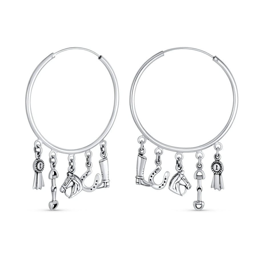 - Our newest equestrian charm sterling silver hoop earrings are anything but boring. Perfect for a fresh look any day. These lucky horseshoe earrings are a must-have for fashionable ladies. Embrace the trend of dangle earrings with these sterling silver horse lover's earrings. Your choice in jewelry will earn you top chic style. The five dangling charms give our equestrian-themed hoops a look you'll love. Crafted in polished 925 sterling silver, featuring a riding boot, horseshoe, horse head, bit, and medal ribbon. These sterling silver hoops are unbeatable. Jump into style and order yours today.
