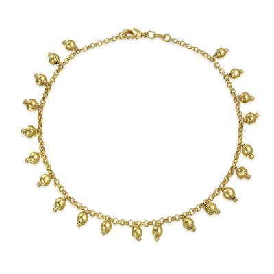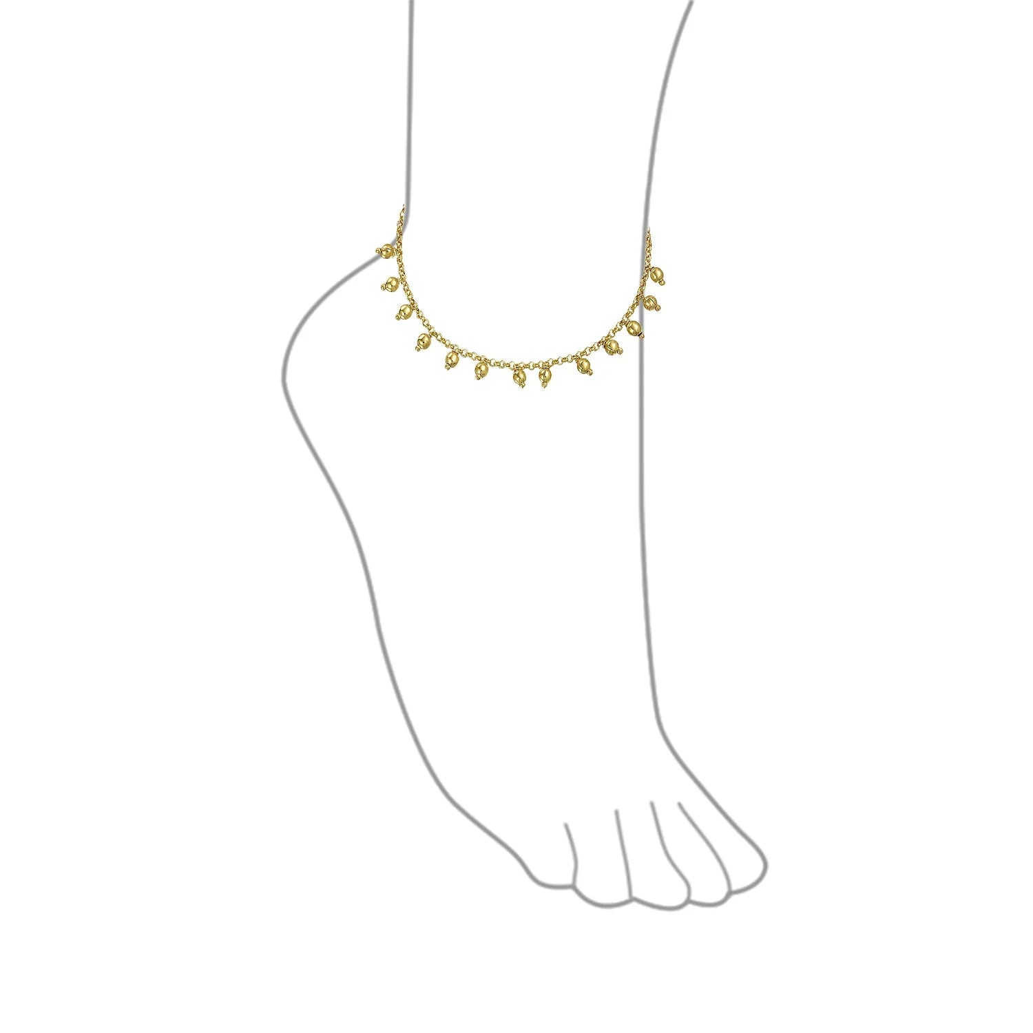 - Express your chic style with our stunning 18k Gold Plated Brass beaded ankle bracelet . The 22 dangling 5mm ball beads add playful movement. Fits up to a 10-inch ankle with an adjustable lobster claw clasp. Perfect for year-round beach jewelry and making a style statement. Show off your friendly side with this fashionable anklet. Order now for a look you'll love!