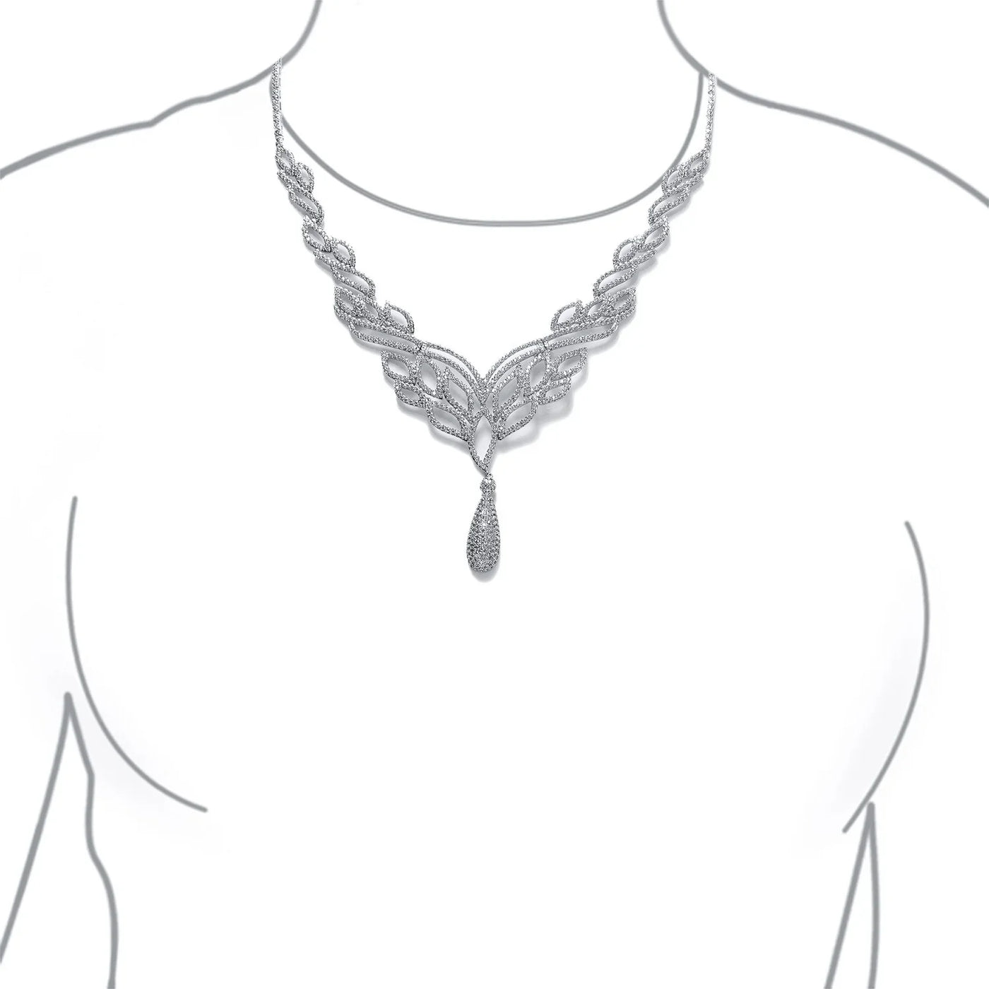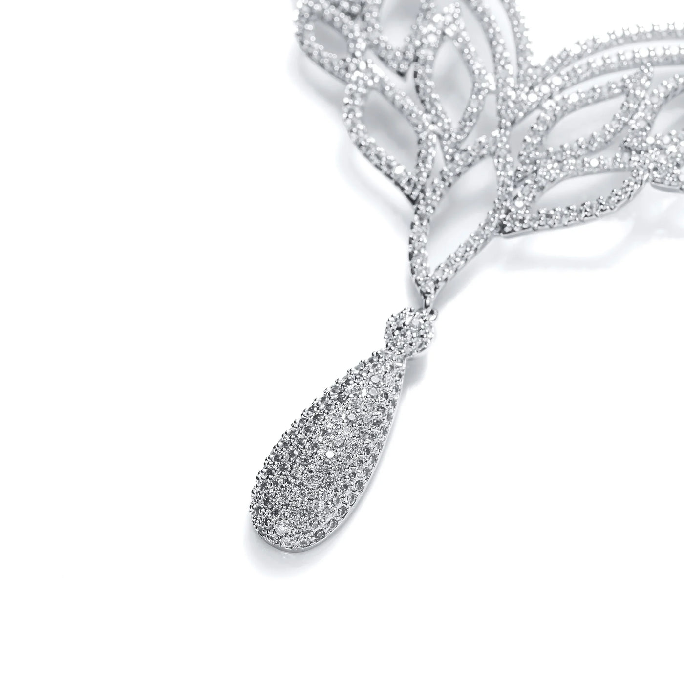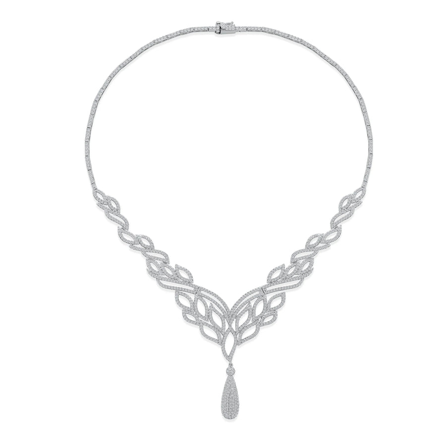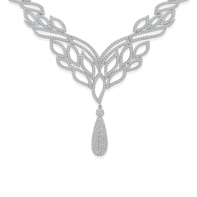 - Exquisite necklace features over 100 dazzling cubic zirconia stones, beautifully arranged in open leaf patterns. The captivating pavé teardrop enhances the décolletage and complements any bridal ensemble. With its substantial weight and secure interlocking tongue clasp with wing closure, this special occasion necklace guarantees a stunning look that stays in place all day.