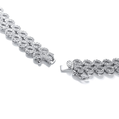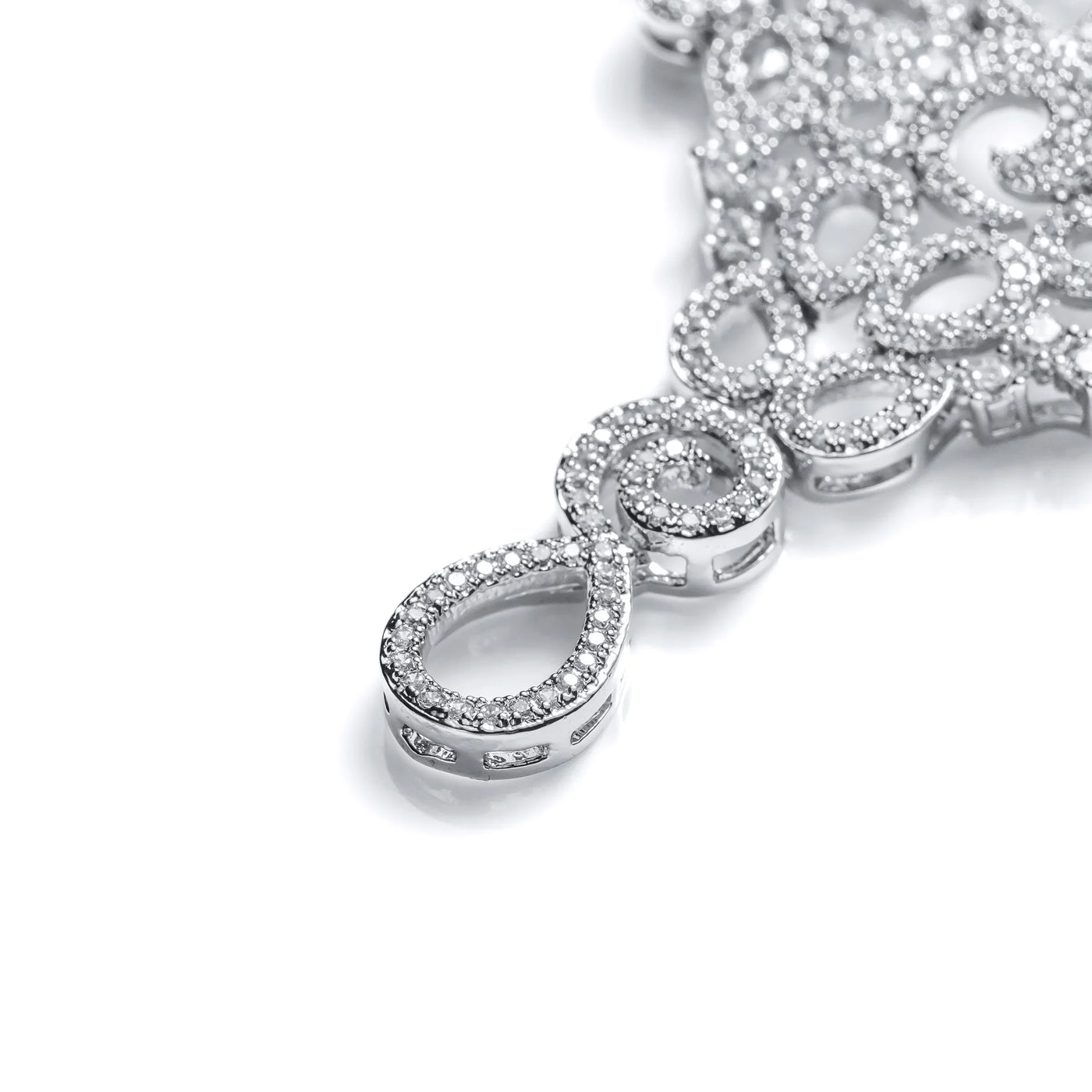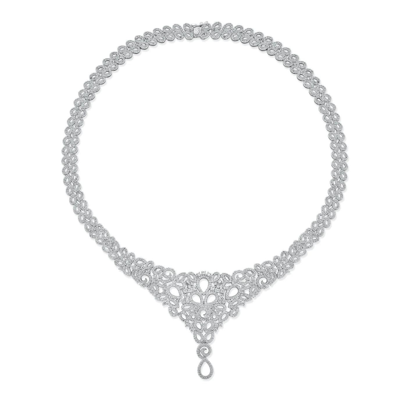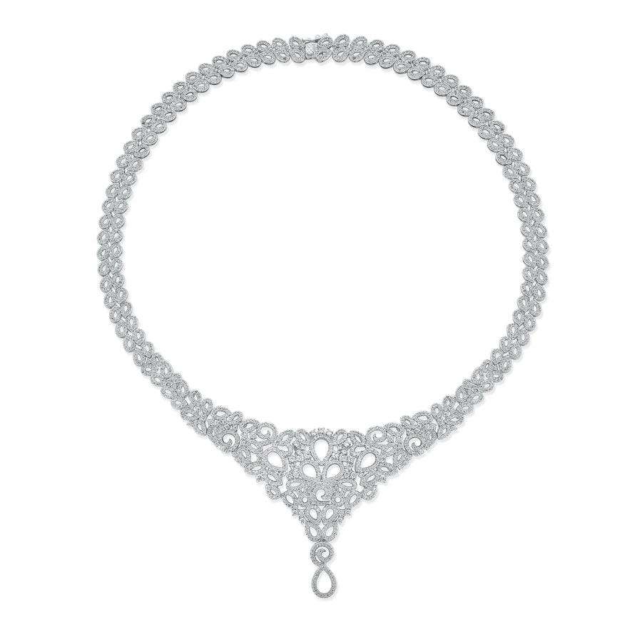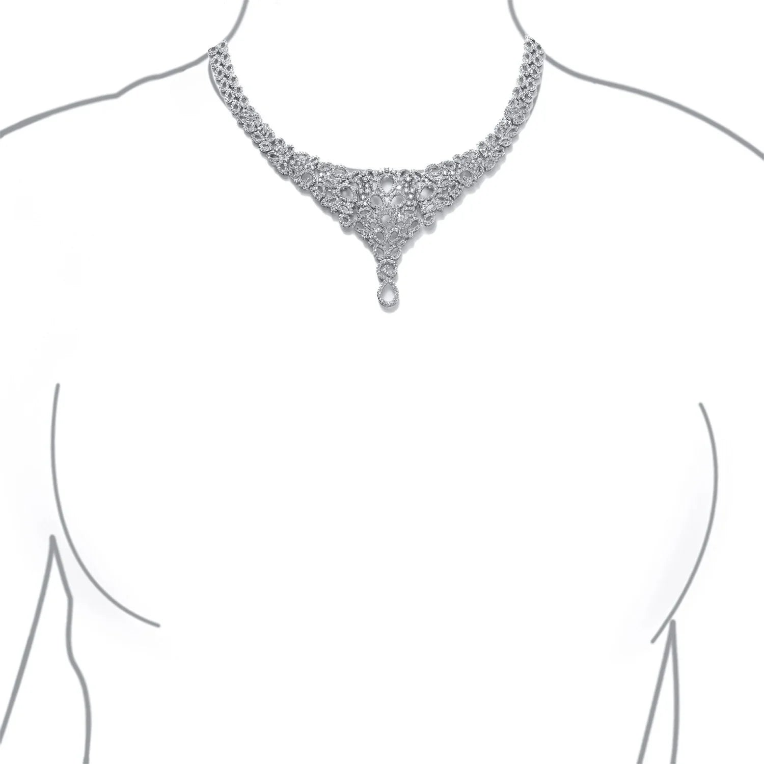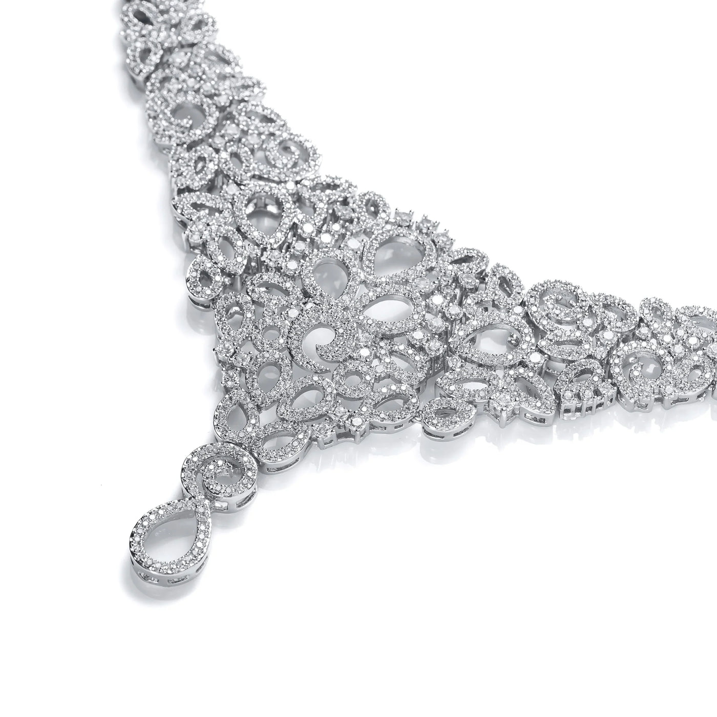 • This stunning wide necklace features over 100 sparkling cubic zirconia stones, elegantly arranged in open swirls and leaf patterns. Its exquisite design enhances the décolletage and complements any bridal ensemble. With a substantial weight and secure interlocking tongue clasp with wing closure, this necklace ensures a remarkable look that stays in place all day.