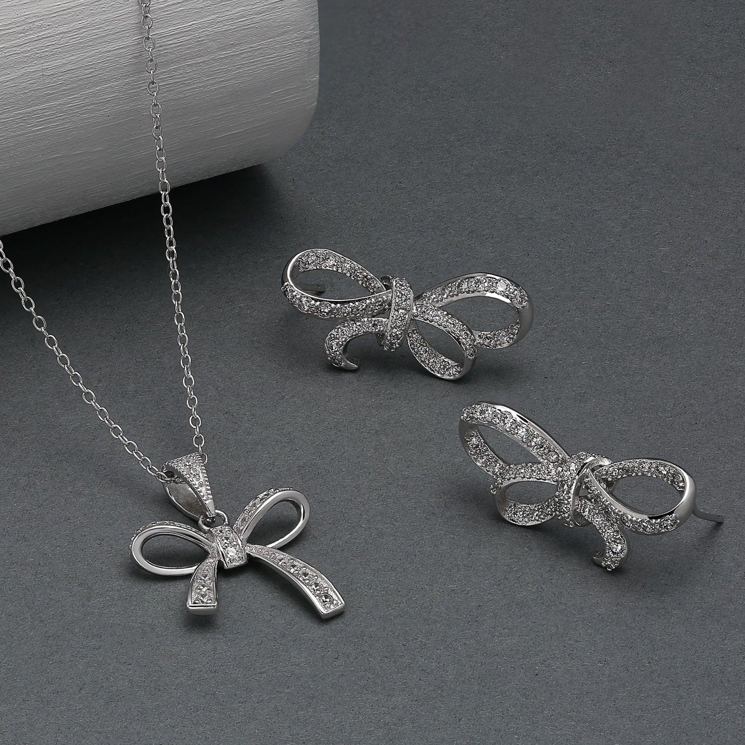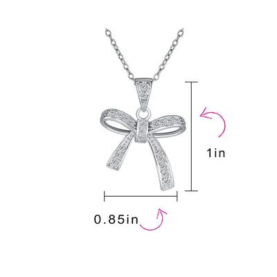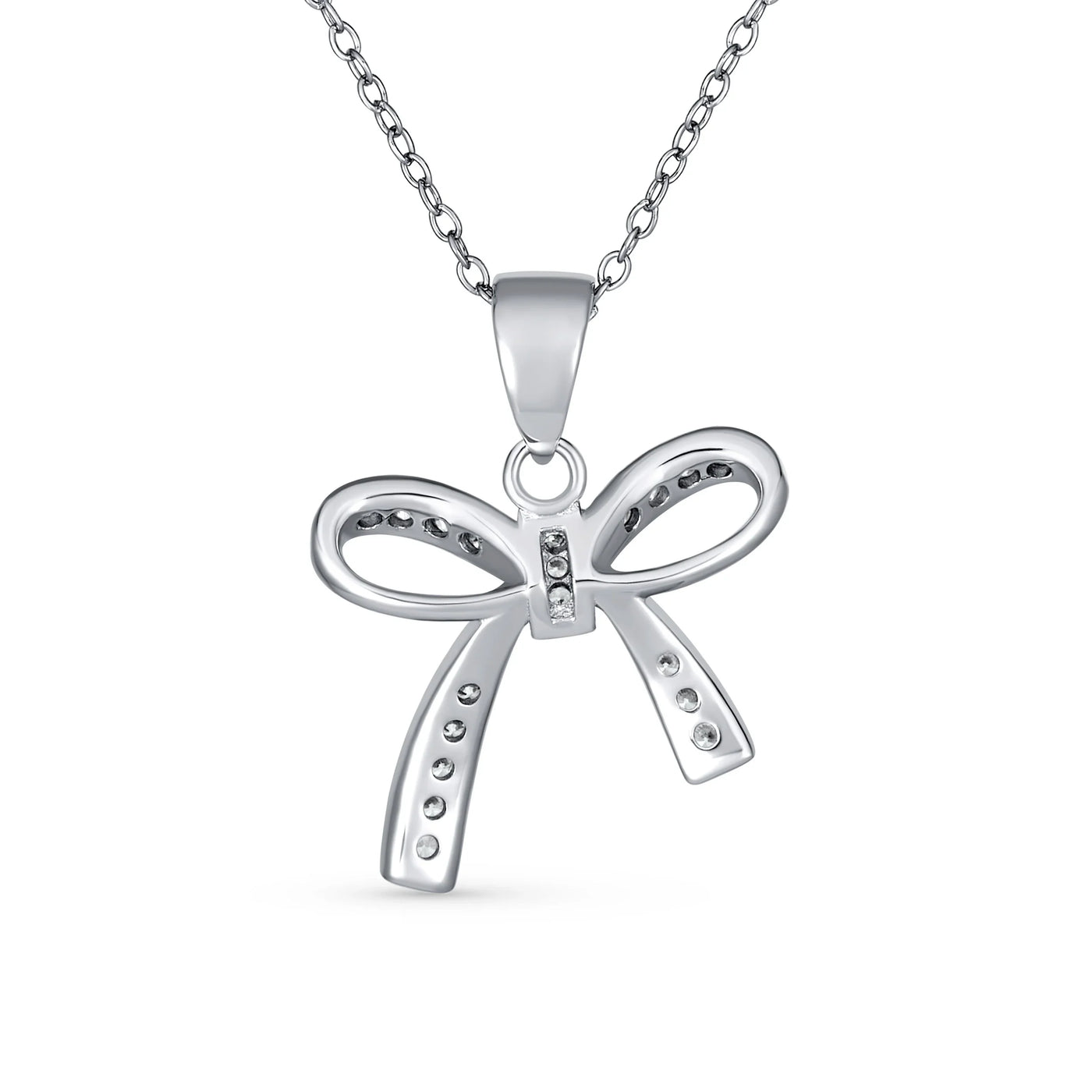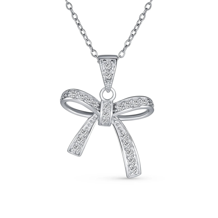 - The modern design gives a cute twist to this classic, chic bow necklace. This 0.86in pendant has pave CZ bling complimenting its sterling silver. On a 16 inchchain this makes a great gift.