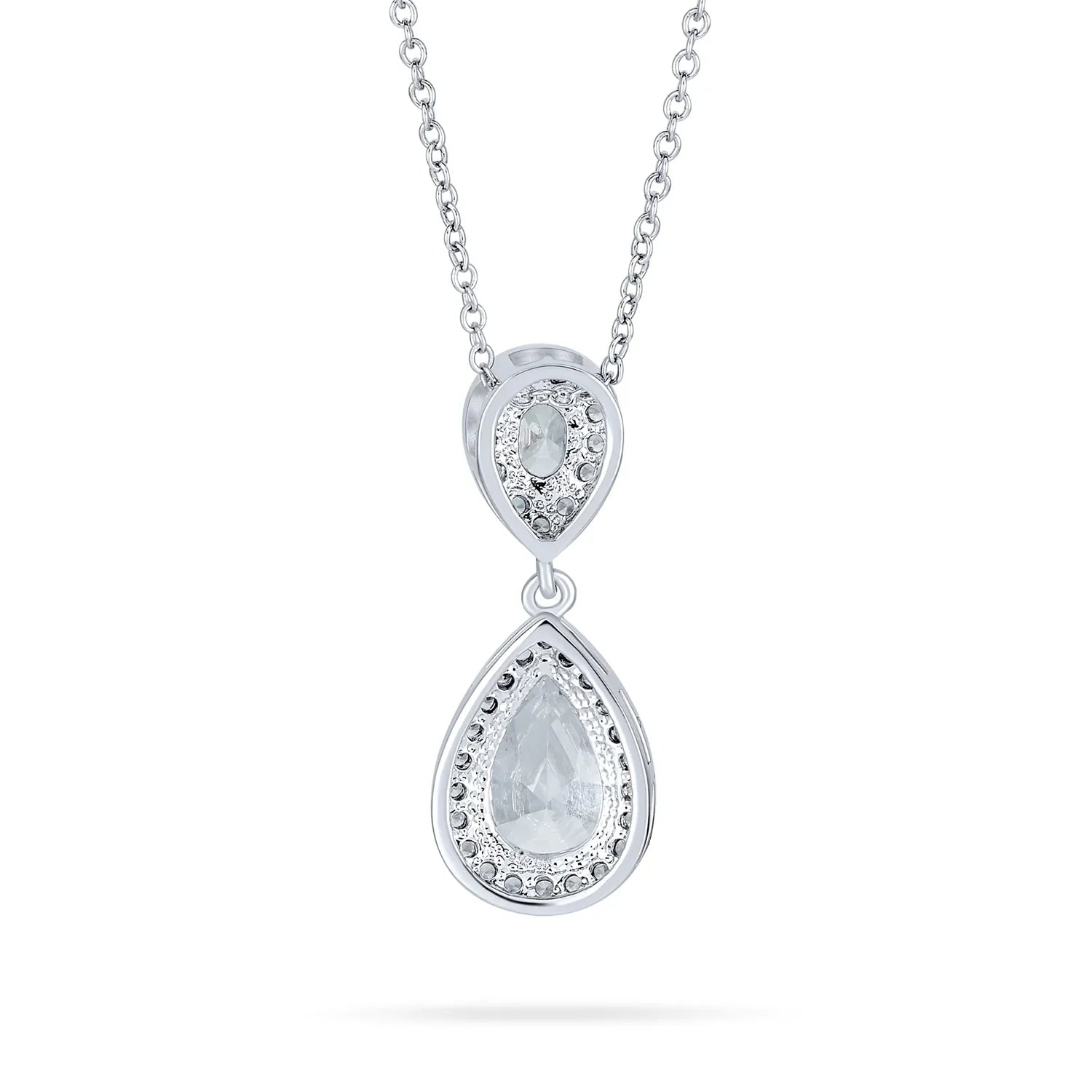 - This stunning teardrop pendant elevates any outfit. It features a 13x9mm pear-shaped Cubic Zirconia stone that shines brilliantly. Surrounded by smaller CZs, it offers exquisite detailing. Ideal for weddings, bridal gifts, or any celebration. Perfect for women who love elegant, formal jewelry. Includes a 16-inch chain with a 2-inch extender.
