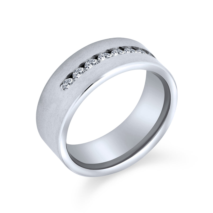 - If you are looking for a durable, hypoallergenic wedding rings, then this men's titanium Wedding Band is just what you are looking for. These gorgeous cubic zirconia rings are pipe cut with a brushed finish and each features nine channel set cu stones. These men's titanium wedding rings, might appear to have only men in mind, but our men's titanium rings are actually unisex. Buy one of these titanium men's Wedding Bands to exchange with your husband on your big day or for your anniversary. If you are interested in matching rings, then a pair of these titanium Wedding Bands would be the perfect way to symbolize your love and lifetime commitment. These 8mm titanium rings for men will not disappoint.