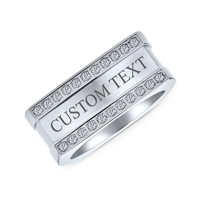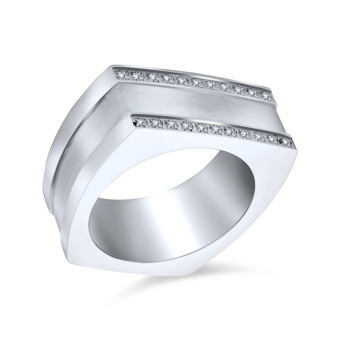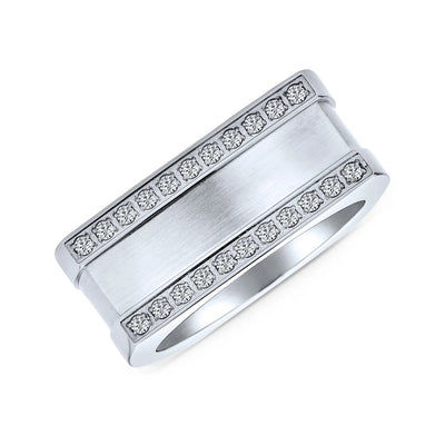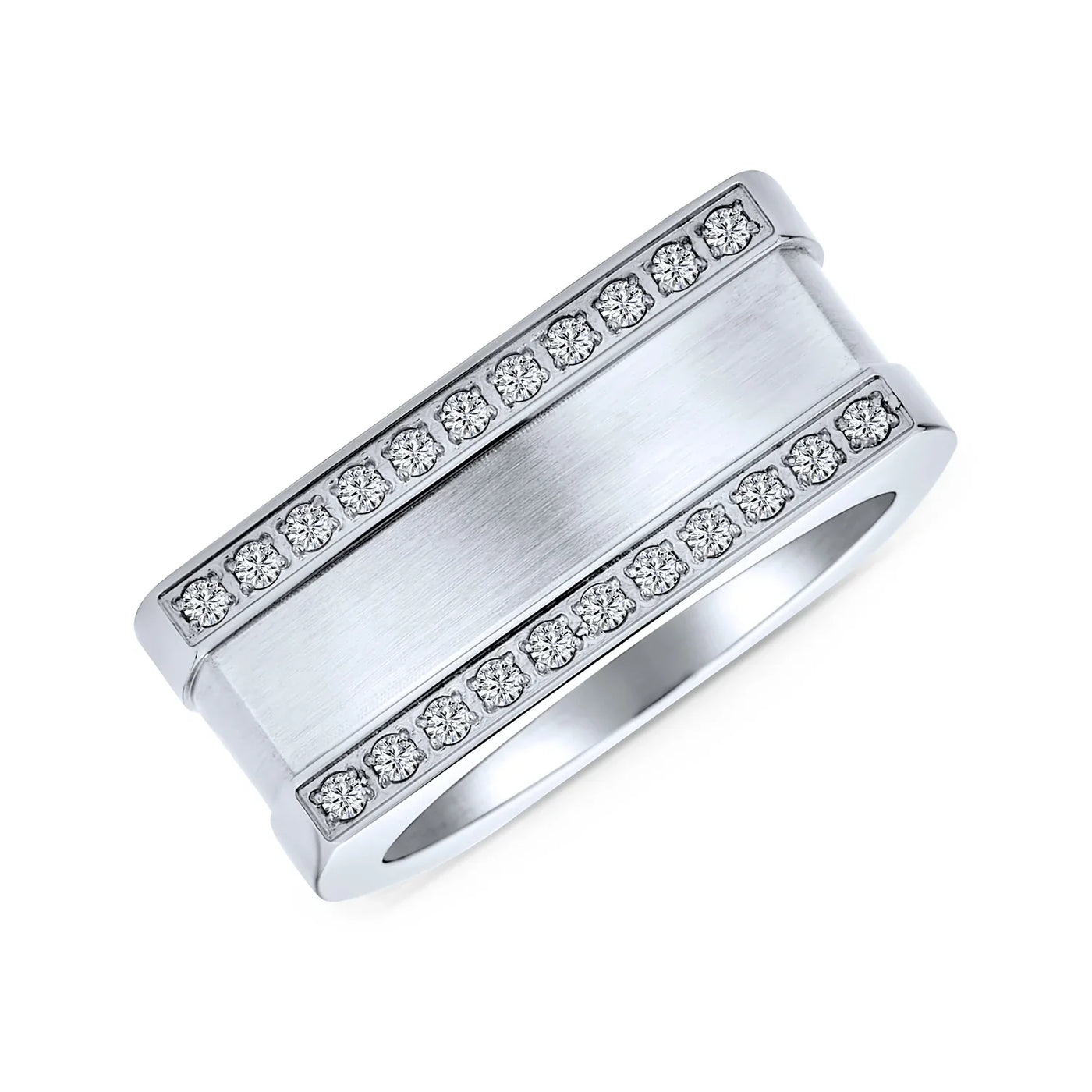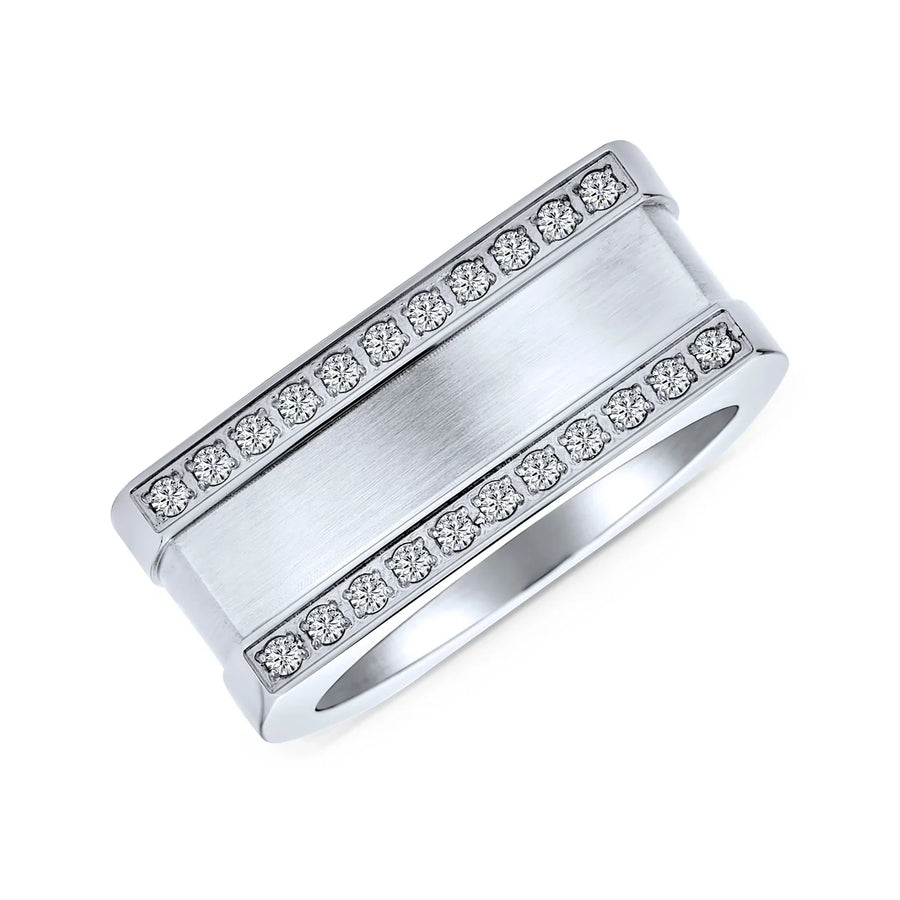 - Upgrade your style with our newest stainless steel cz ring. This parallel lines design exudes refinement and classic elegance for men. Perfect for Father's Day or self-treat, this geometric grooved ring is a must-have. It adds sophistication to any outfit and complements a distinguished, masculine look. Crafted with care, this stainless steel ring is ideal for rugged style enthusiasts. The outer border features two rows of shimmering CZs, adding sparkle. The center row has a matte finish, contrasting the polished outer edges. This square stainless steel ring transitions effortlessly from casual to business attire. Elevate your fashion game with our exquisite geometric jewelry. Order now and experience the timeless appeal of our stainless steel cz ring.