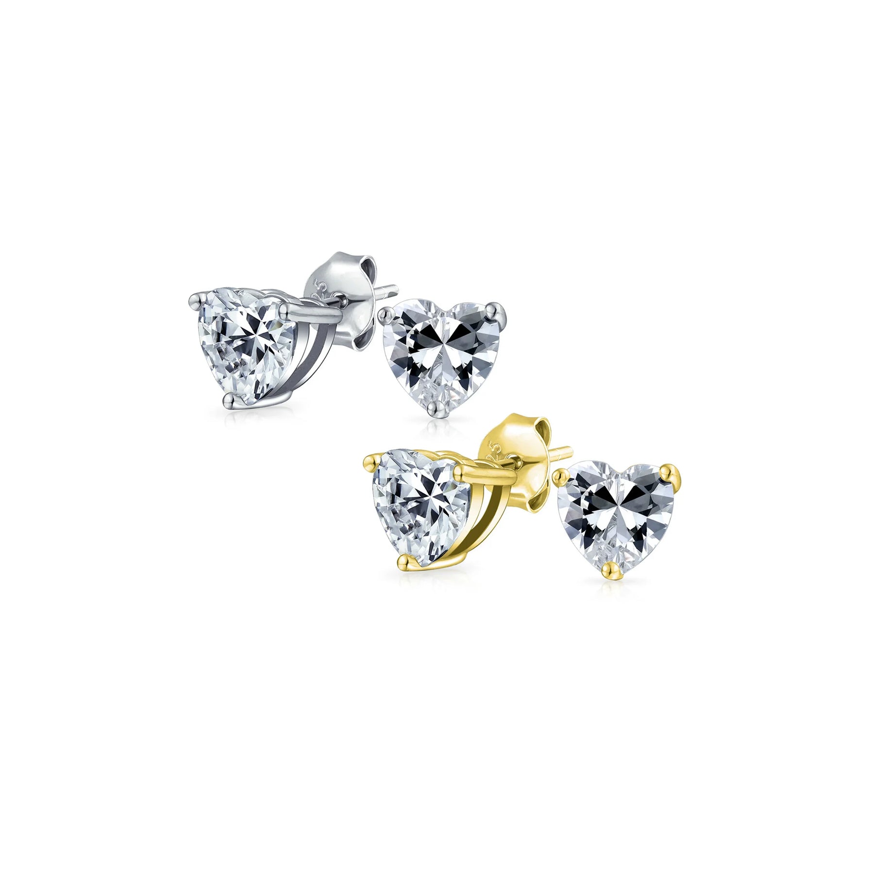 - Crafted from rhodium-plated sterling silver, these stunning heart-shaped stud earrings sparkle brilliantly. Available in various carat sizes. Classic 3-prong setting exudes prestige and elegance. Perfect for pierced ears, they turn heads instantly.