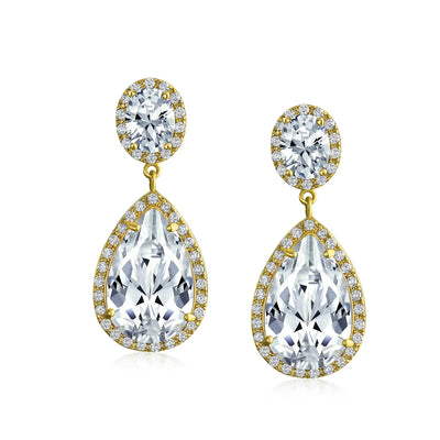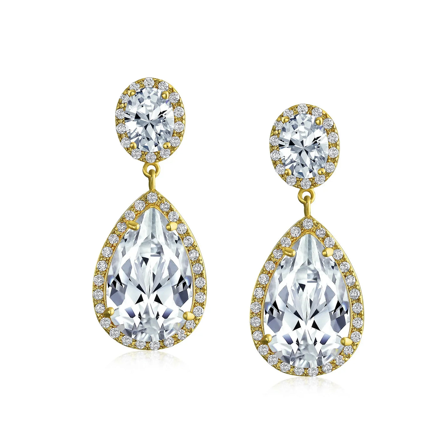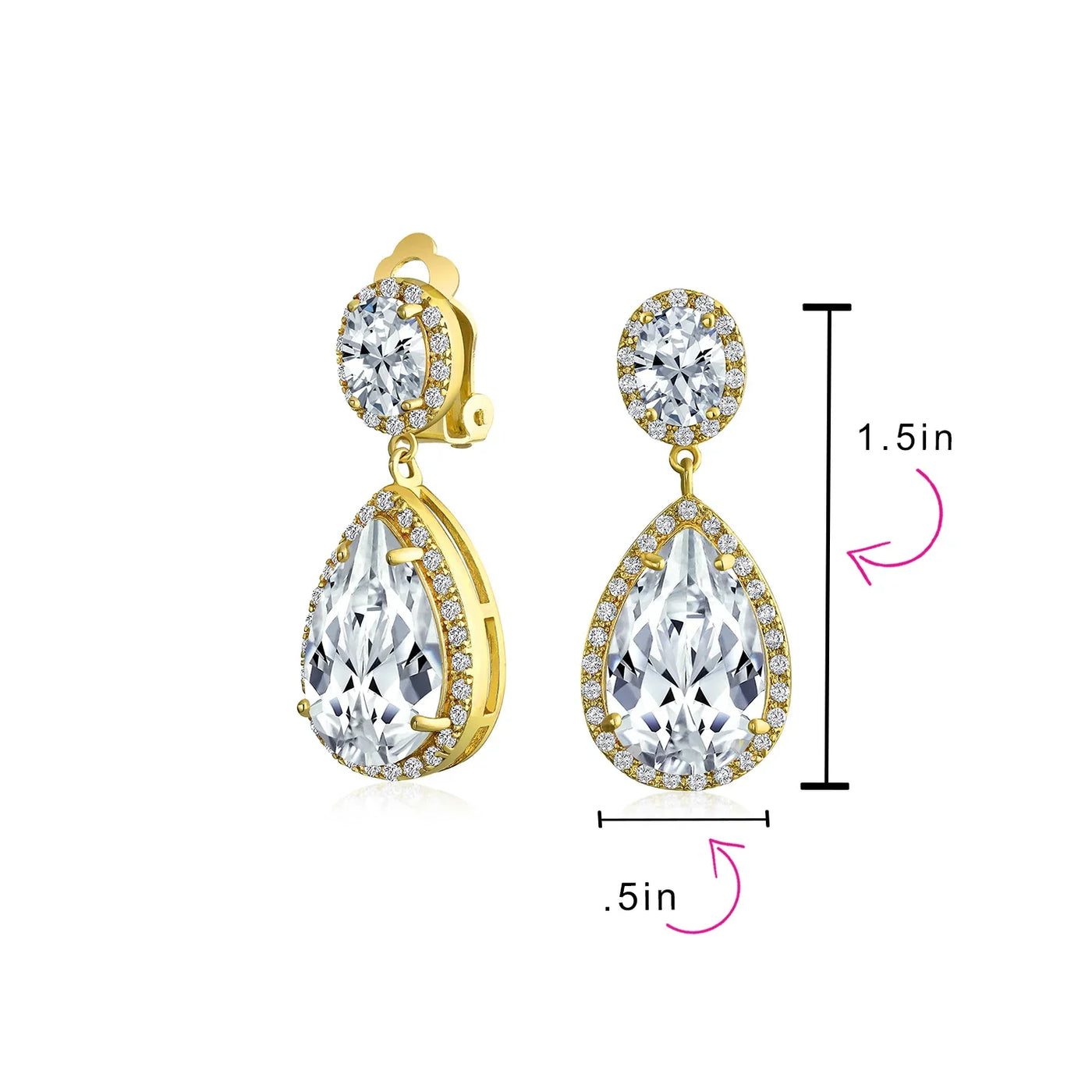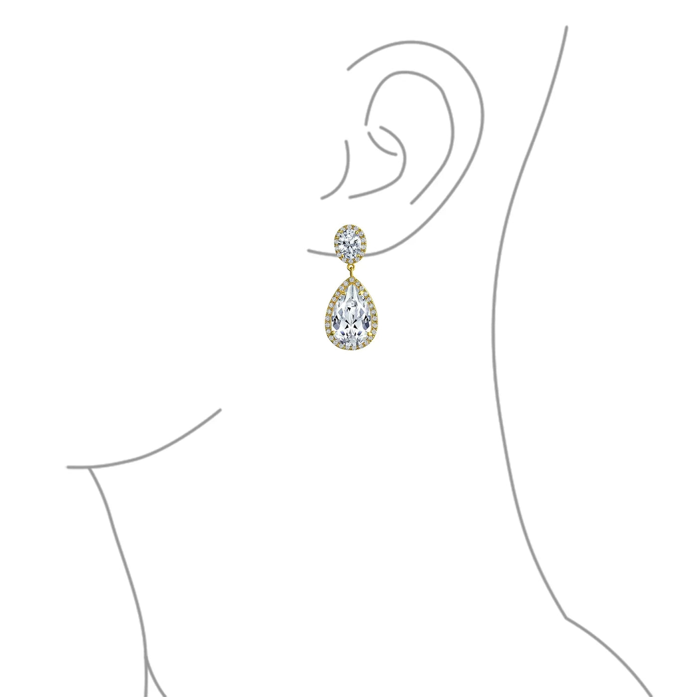 - With their celebrity style look and nonstop dazzle, these teardrop earrings are sure to leave you're carpet ready. We used gleaming Gold Plated metal and glittering cubic zirconia to create gorgeous Gold Plated jewelry that adds the perfect touch to your look. The top section of our cz earrings show off an oval cut stone, surrounded by delicate, round cut CZs. The bottom section has a massive tear drop cut stone that also gets decorated with smaller, pave set stones. Despite their decadence, these drop earrings measure a little less than an inch and a half long, and only weigh 8 grams each. They attach with a comfy clip on style Clip that makes them great for any wearer, regardless of whether they have pierced ears. You know you want to look like a star at your big event, so order this stunning cz jewelry to wear as unforgettable prom jewelry, or let it accompany you down the aisle as the perfect pieces of bridal jewelry to wear on your big day.
