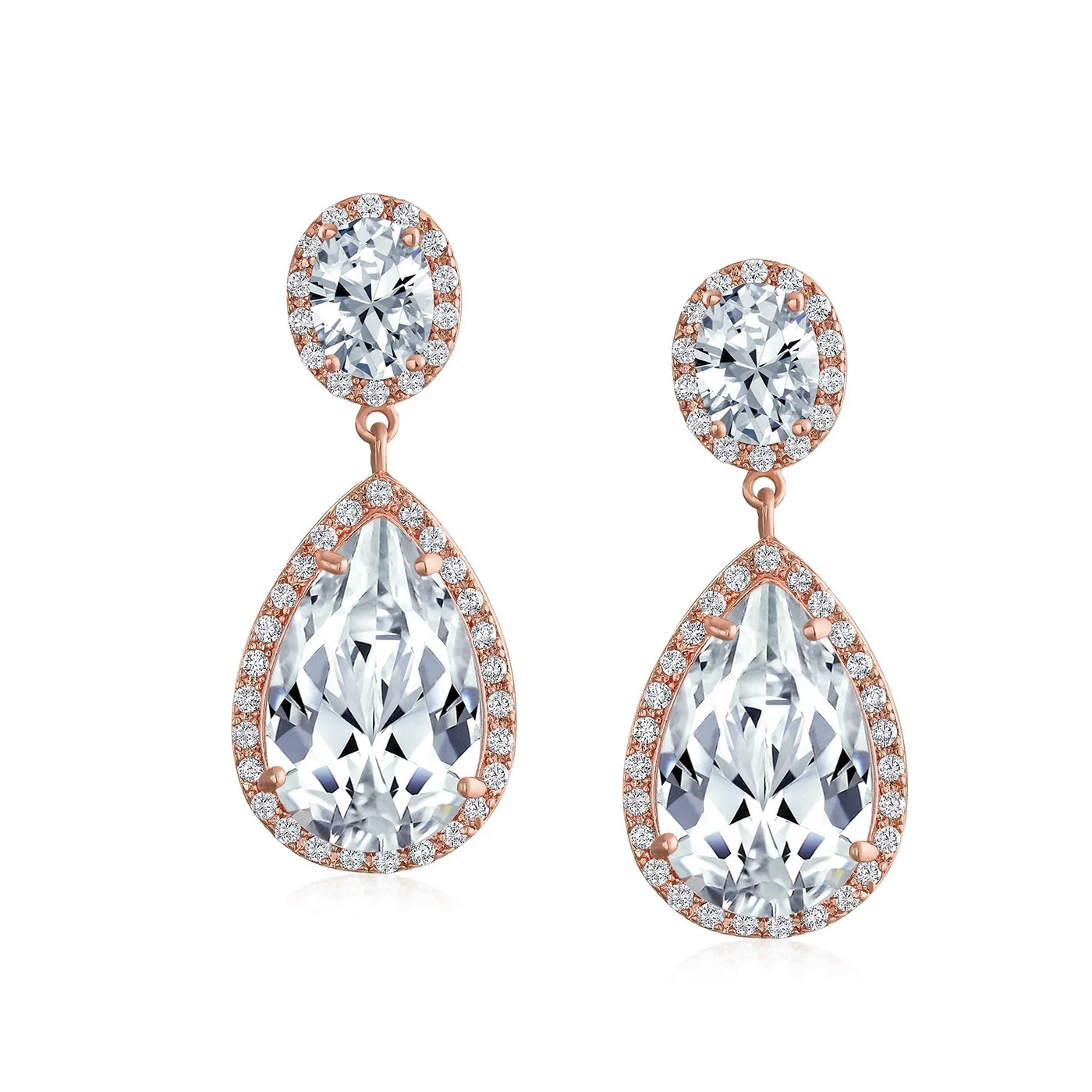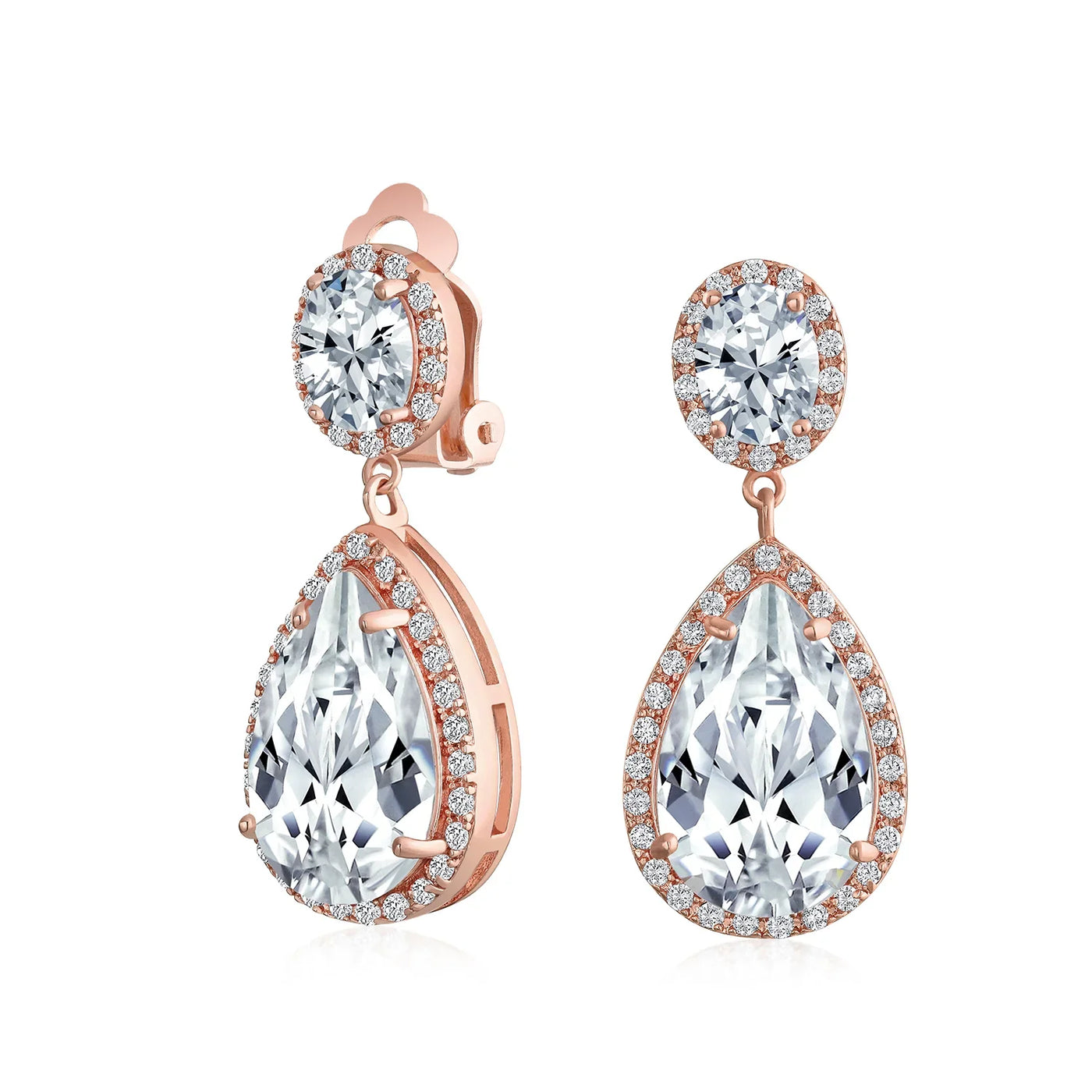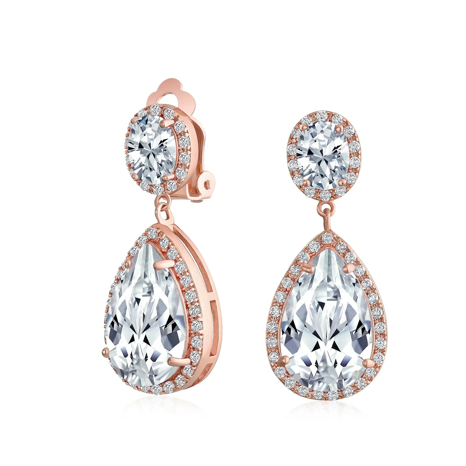 - GLAMOROUS DESIGN - Exude the glamour of red carpet style in these simply stunning, rose gold plated brass chandelier clip on earrings for non - pierced ears. Highlighted by alluring, oval and pear, clear cz crystals with glistening pave cz accents.