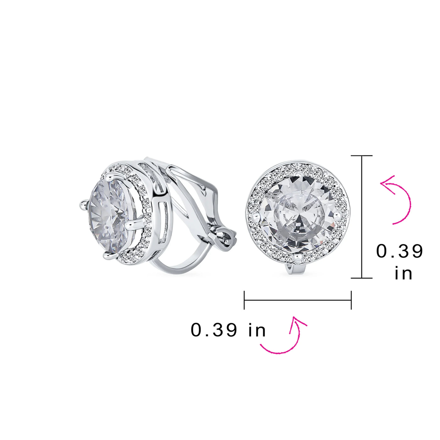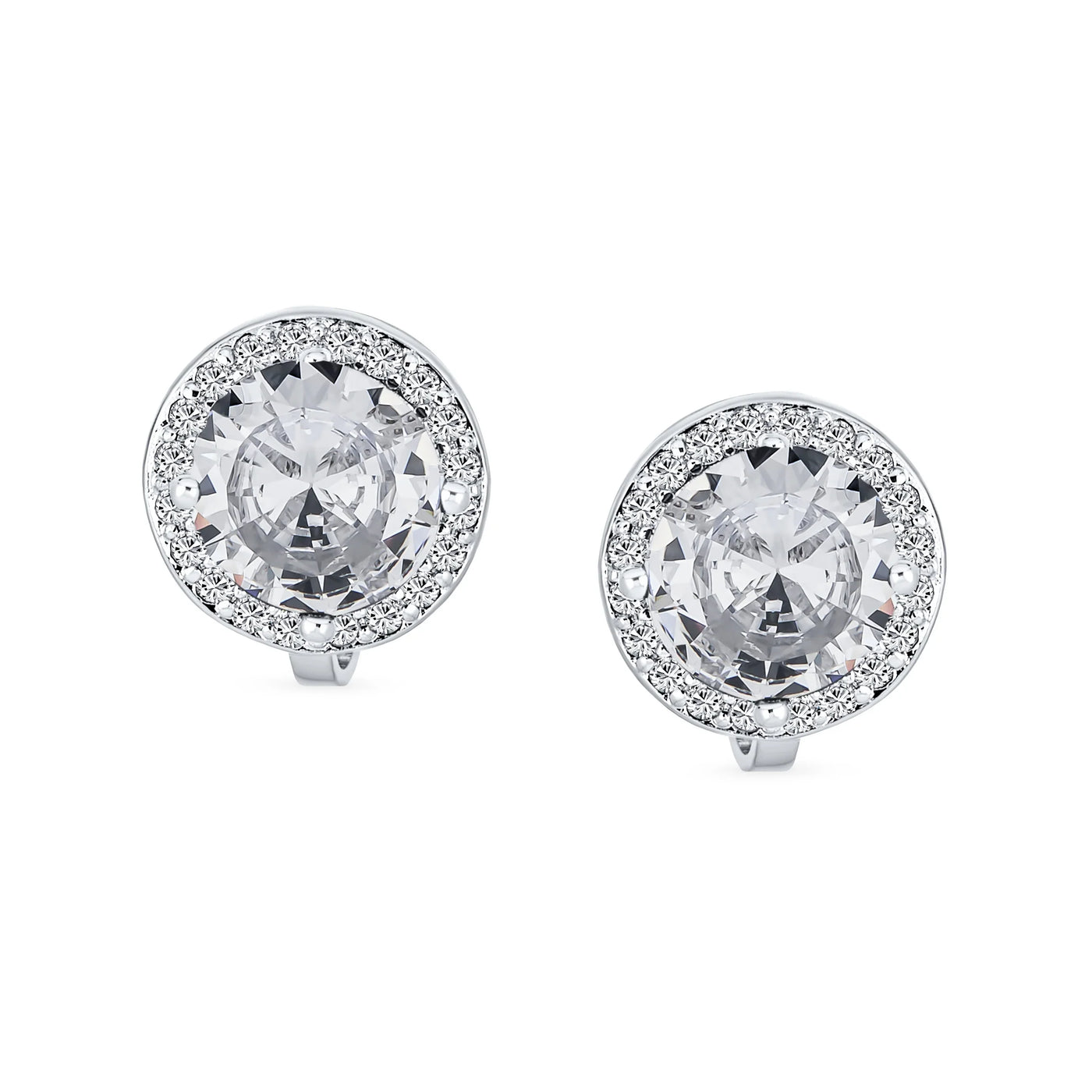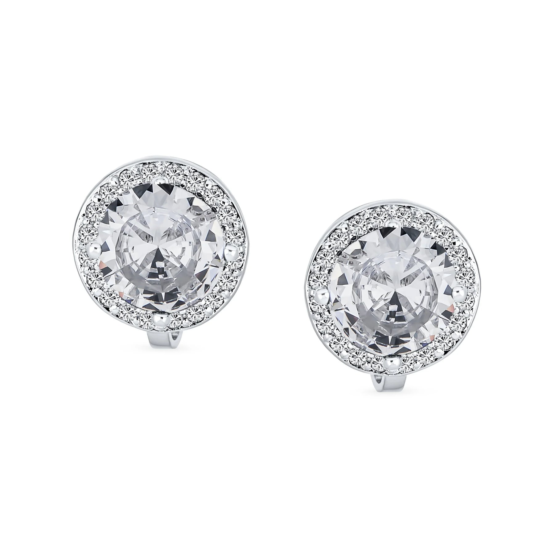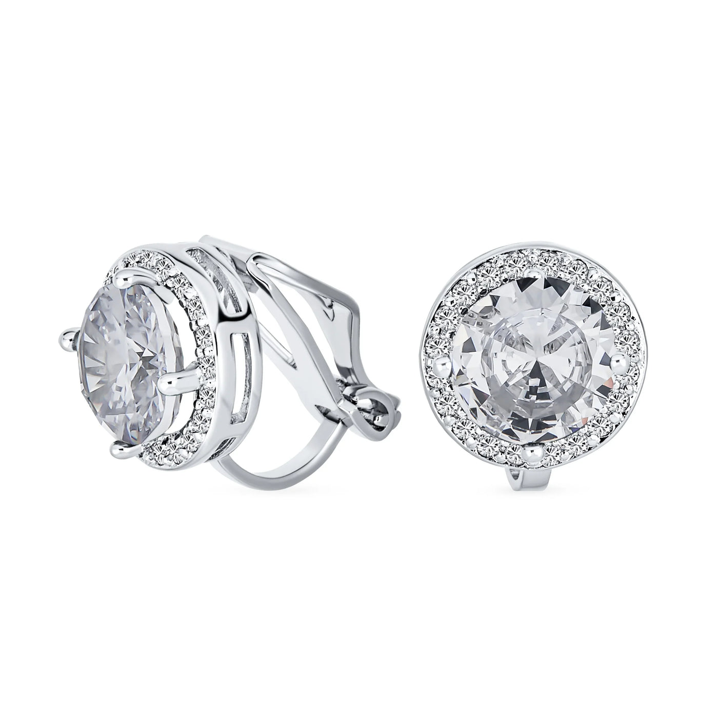 - Our round Halo solitaire clip-on earrings are perfect for non-pierced ears. Featuring a 7mm cubic zirconia stone in a four-prong setting, these earrings shine brilliantly. Made with silver plating, these CZ bridal studs attach comfortably and fashionably. Rhodium plating ensures long-lasting shine. Expect compliments when you wear these stunning CZ stud earrings for women.