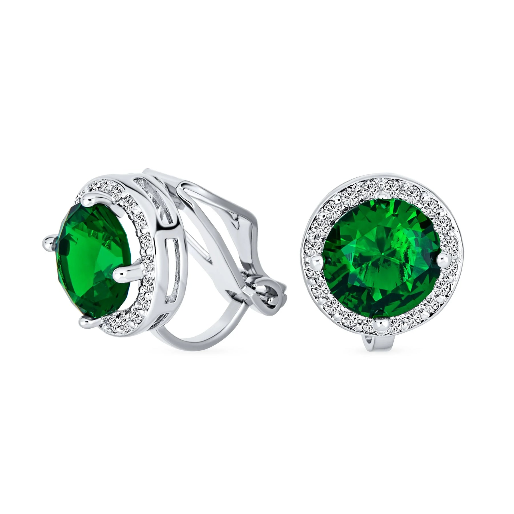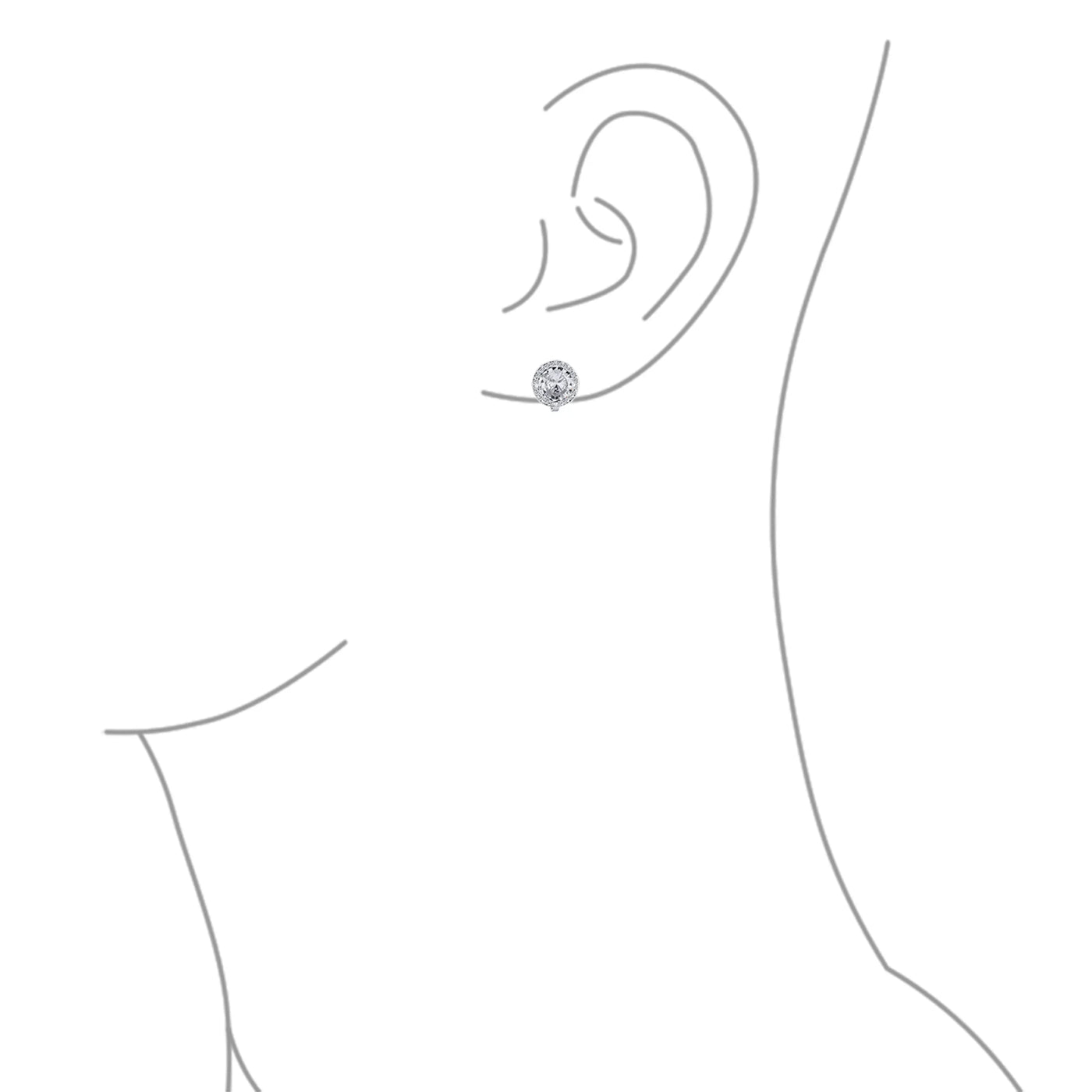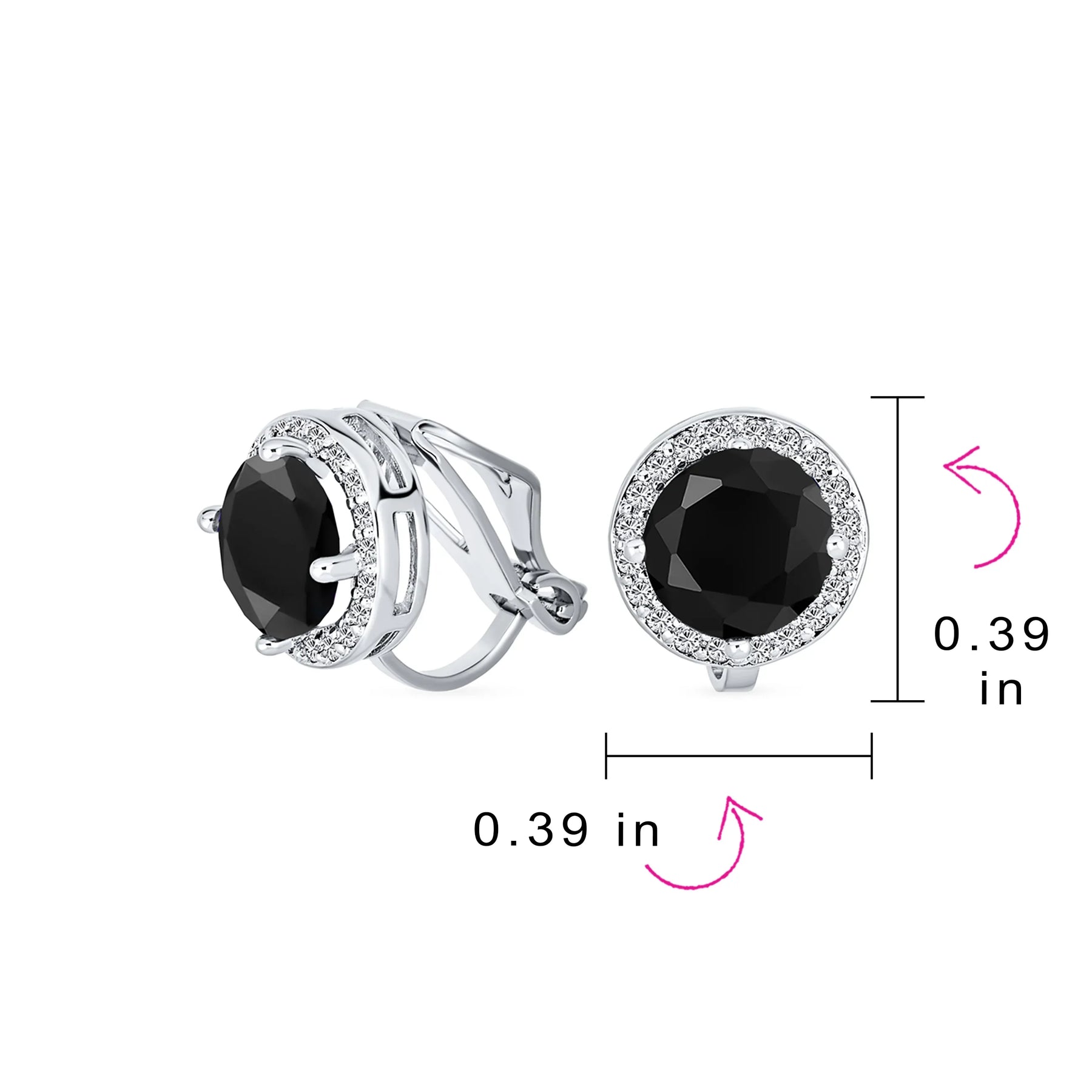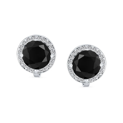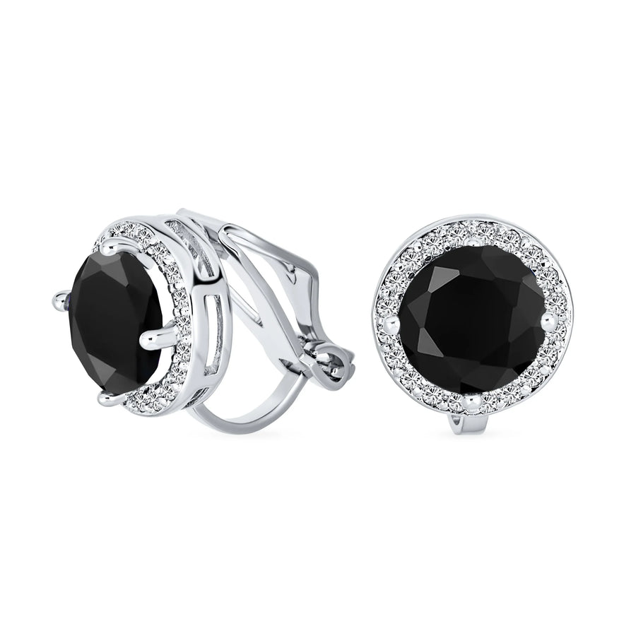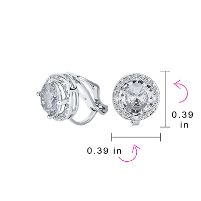 - Our round Halo solitaire clip-on earrings are perfect for non-pierced ears. Featuring a 7mm cubic zirconia stone in a four-prong setting, these earrings shine brilliantly. Made with silver plating, these CZ bridal studs attach comfortably and fashionably. Rhodium plating ensures long-lasting shine. Expect compliments when you wear these stunning CZ stud earrings for women.