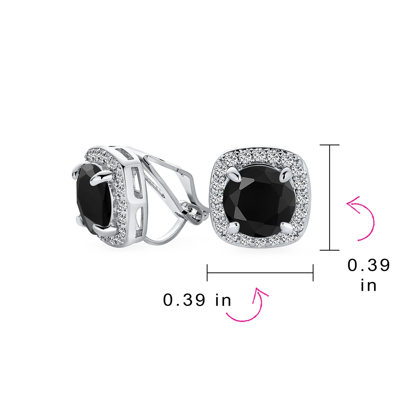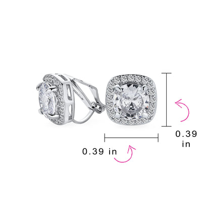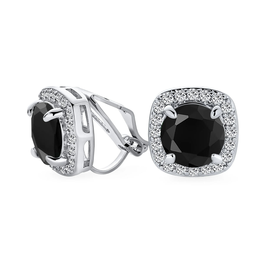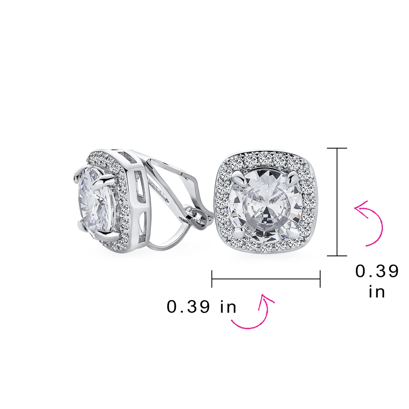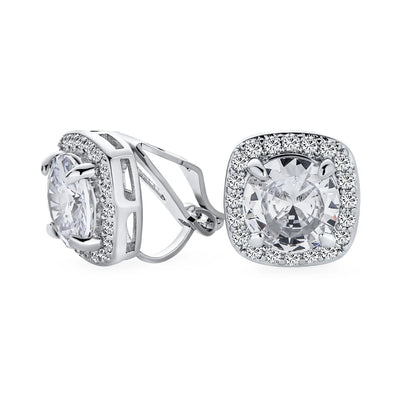 - Our square Halo solitaire clip on earrings are a great choice for the jewelry lover who does not have pierced ears. Featuring an 8mm cubic zirconia stone secured by a four prong setting, these clip on stud earrings will look great on you. Made out of sliver plating these cz bridal studs attach to your ear comfortably and fashionably. These round cz earrings are rhodium plated so they will remain shiny for years to come. Be prepared to receive compliments when you don this pair of cz stud earrings for women.