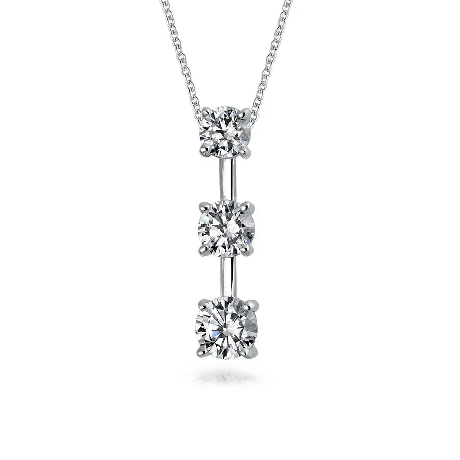 • Celebrate the timeless love story with this romantic bridal necklace featuring a stunning three CZ focal point. Crafted with sparkling sterling silver and a modern drop pendant design, this necklace is the perfect gift for any special occasion.