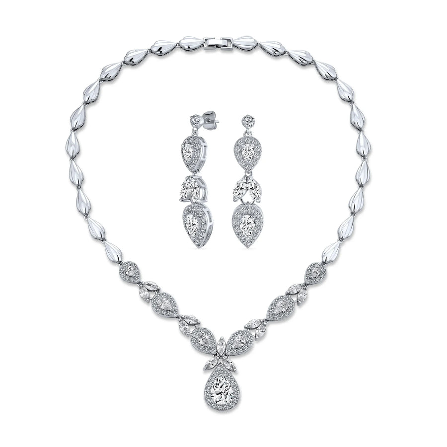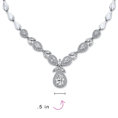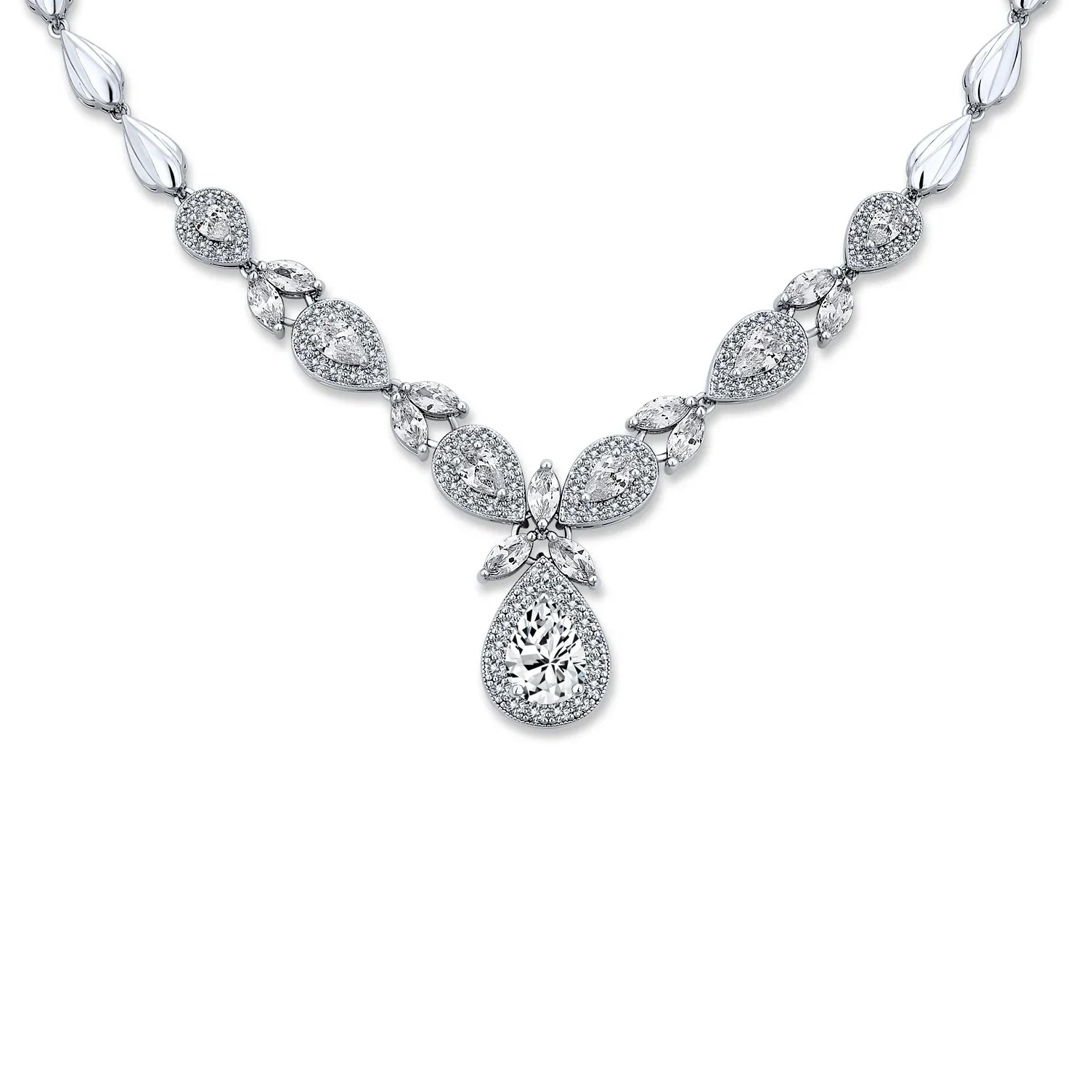• Enhance your bridal look with our vintage-inspired jewelry. The stunning necklace features a dazzling CZ teardrop pendant. Meticulously crafted and rhodium plated, it ensures a radiant shine. Perfectly blending timeless charm with contemporary style, it's a must-have for any unforgettable bride.