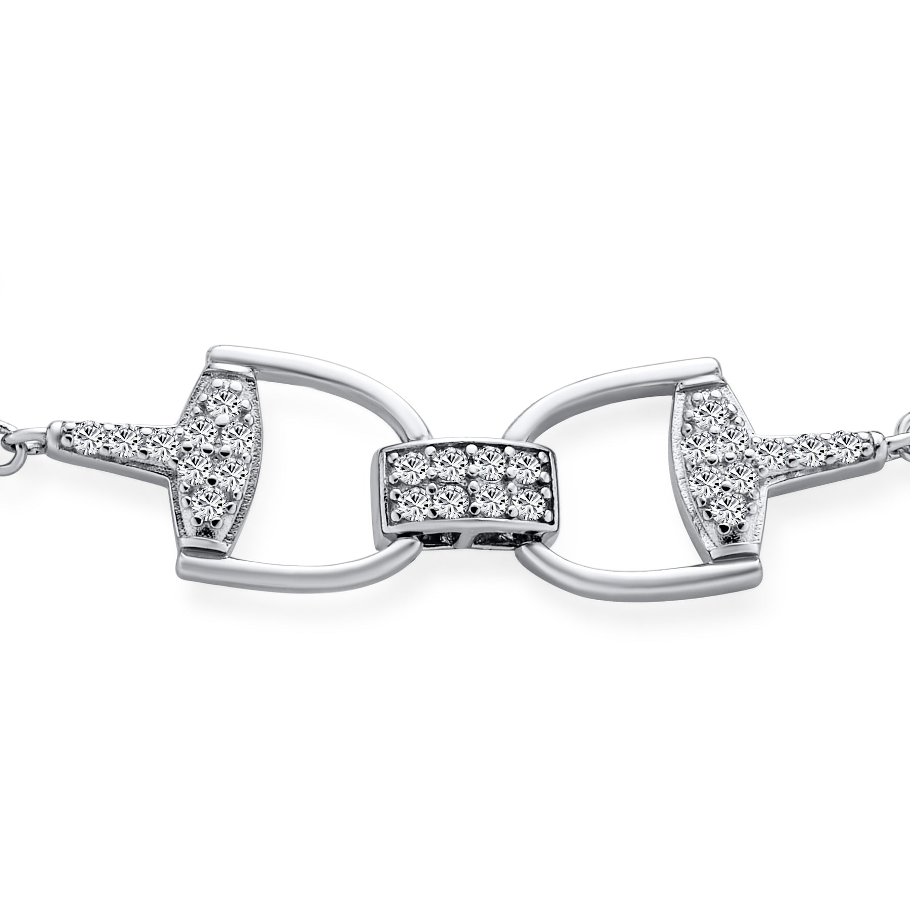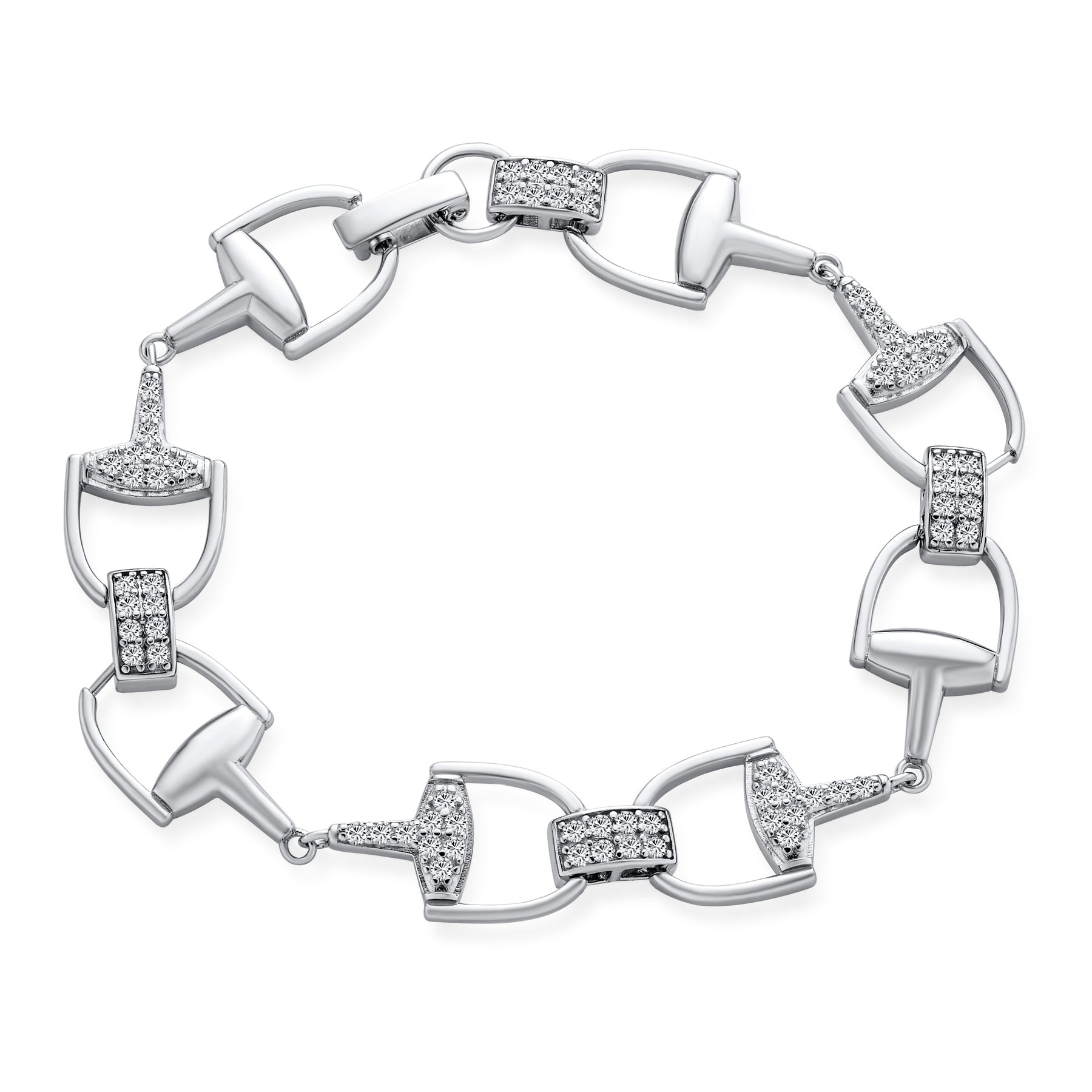- Love equestrian accessories? Our CZ horse bit link bracelet is a must-have. Rhodium plated with CZ accents for chic sparkle. Perfect for any outfit. Show your horse sense and fashion sense. Secure fold-over clasp ensures it stays on. Ideal for horseback riding or fun outings. Equestrian motif complements all wardrobe basics. From office to evening, it fits every look. Celebs love the horse bit design. Get the trendy look for less. Order now!