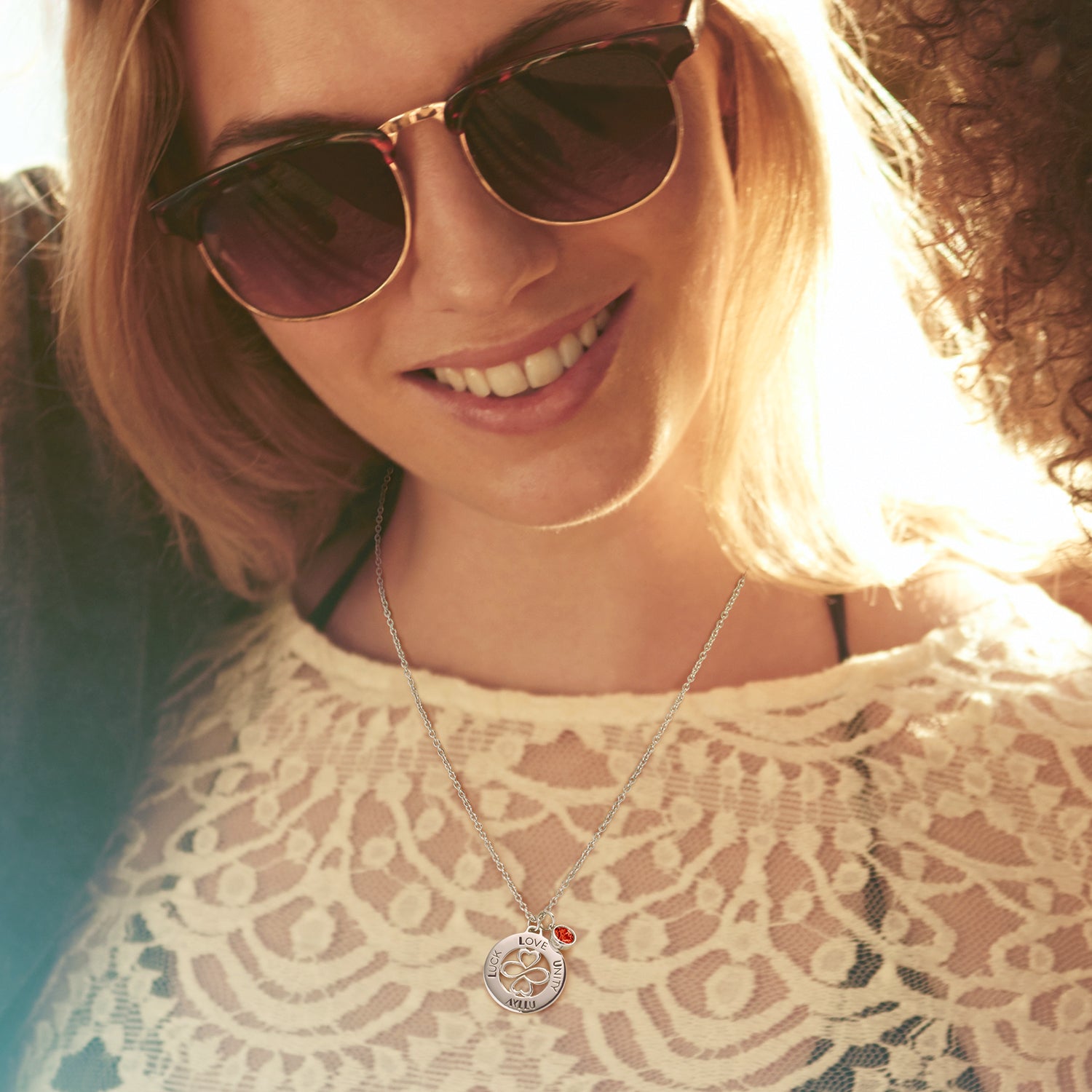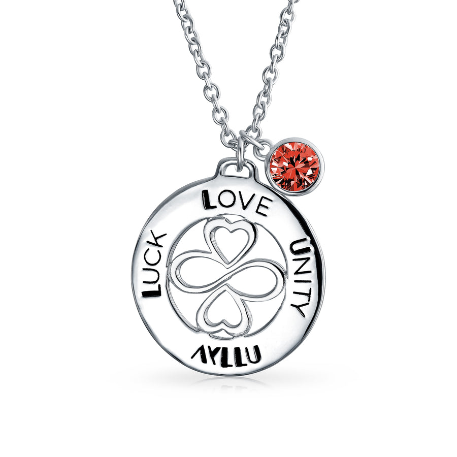 - Rosey Red delicate crystal charm for January birthday birthstone gift. Stunning necklace with elegant circle pendant and AYLLU symbol. Inscribed with inspirational words. Celebrates AYLLU's ideals of love, luck, and unity. Lustrous sterling silver.
