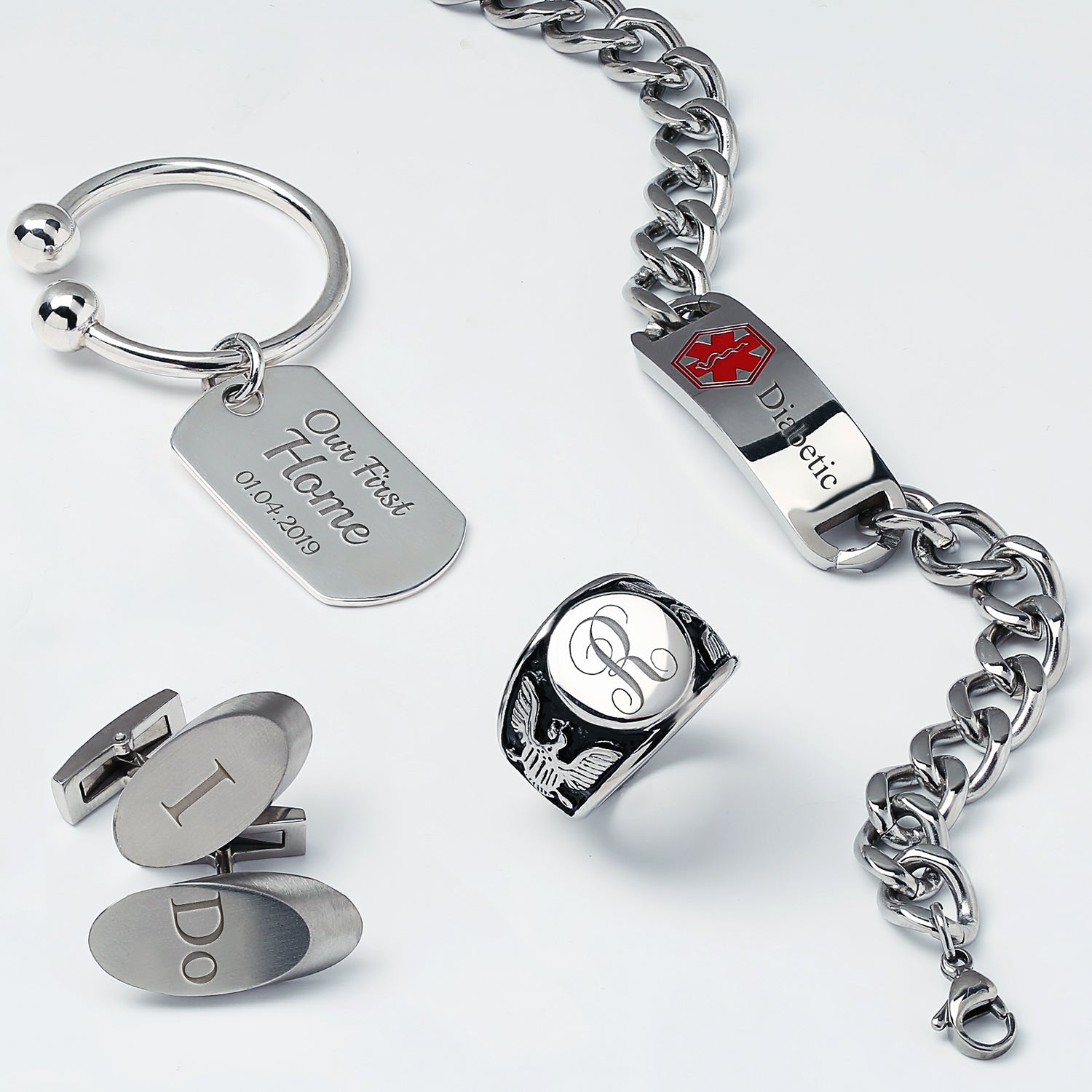 - This unique round signet ring showcases two majestic bald eagles on either side of a monogram circle. It exudes a timeless and classic design, making it the perfect gift for a patriotic Dad or Military Veterans from the Army, Navy, Air Force, or Coast Guard.