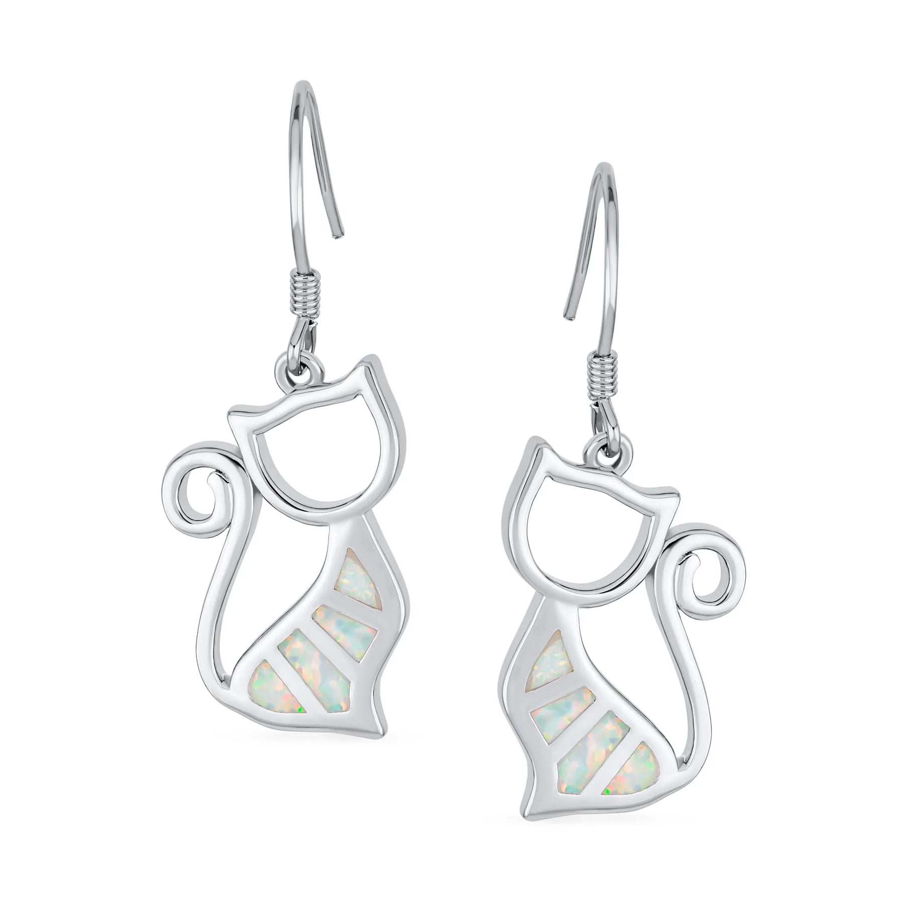 • Your cat brings you joy, so express it with these adorable cat earrings. Showcase your love for your feline friend. Animal jewelry has never looked as good as these opal earrings. Featuring a fishhook back finding, they are easy to wear. Weighing just 4.7 grams, these .925 sterling silver earrings are lightweight. Perfect for yourself or a fellow cat lover, they are sure to delight. Get your pair of these cute cat earrings today!
