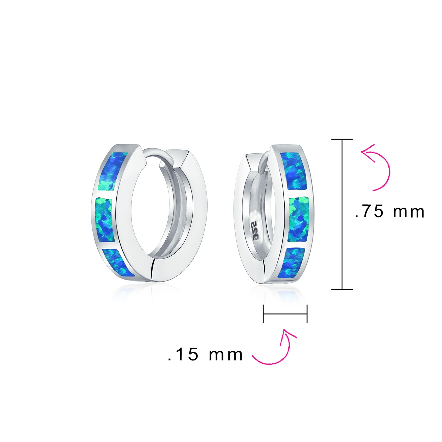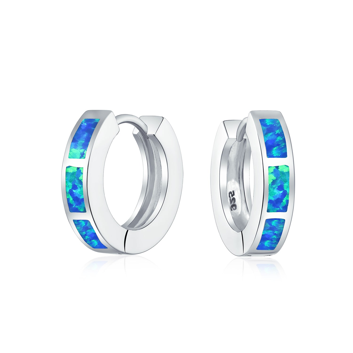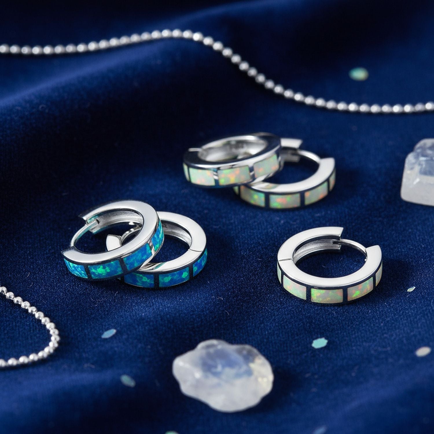 - Our sterling silver Created opal earrings catch the sunlight or candlelight and you will have a glow that is hard to beat. These huggie hoop earrings are designed featuring three rectangular Created Blue Opal inlay stones on the front.