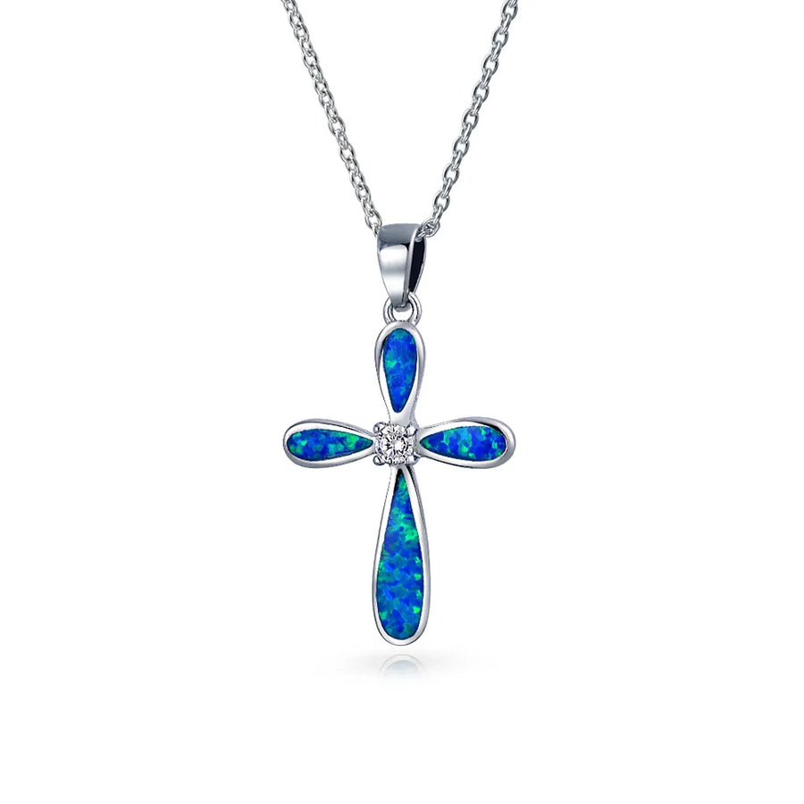 • If you love vibrant blue Opal jewelry, this sterling silver CZ cross is a must-have. Perfect for making any outfit pop, our stylish blue cross pendant necklace is a chic piece of religious jewelry. Combining spiritual elegance with modern flair, this silver CZ cross is an inspired choice. Ideal for the modern fashionista with timeless devotion.