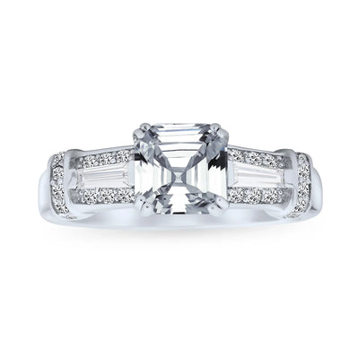 • Enhance her elegance with these cz engagement rings. Pave and baguette stones flank an Asscher cut center stone. Polished sterling silver band with filigree motif. Perfect for women of all styles. Art Deco and Vintage Style chic.