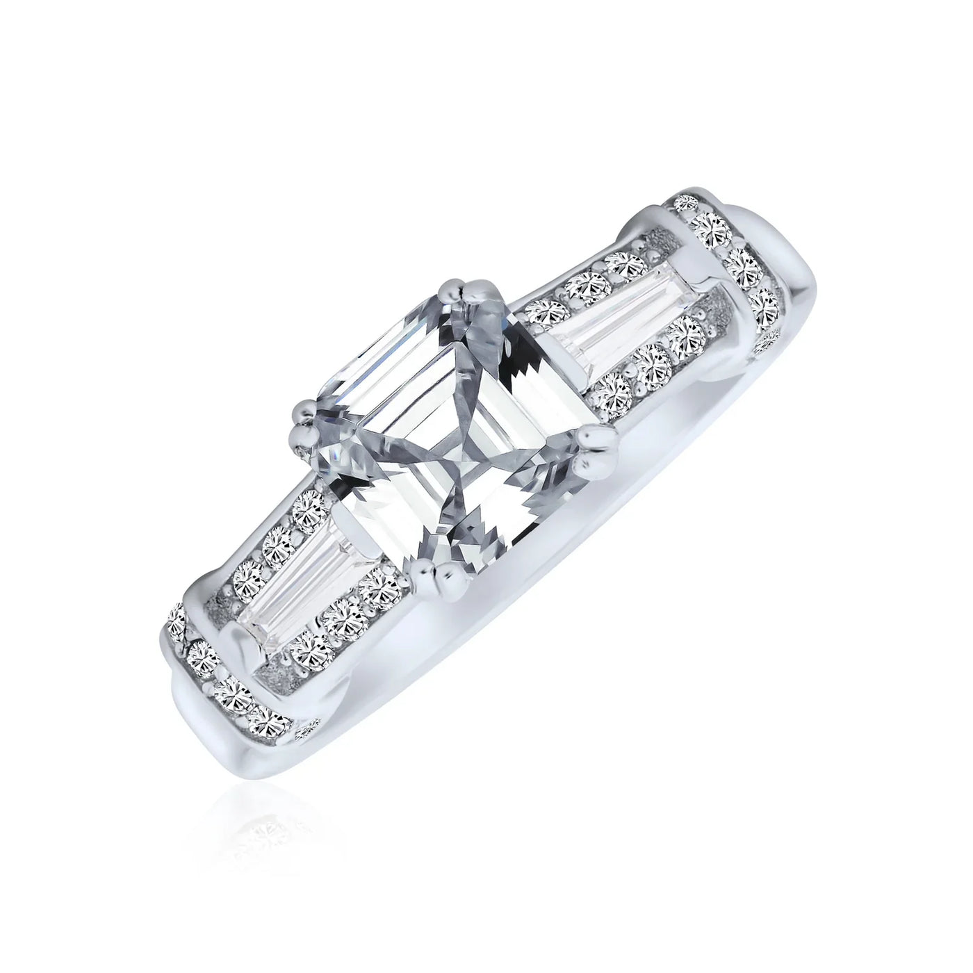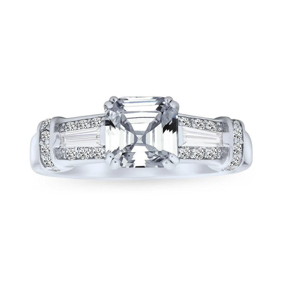 • MODERN RINGS - Ravish your beloved bride to be with this tantalizing, vintage style engagement ring. Accented by a stunningly alluring Asscher cut cz center stone enhanced by lustrous pave and baguette side stones on a sterling silver fashion band. Size 6 ring