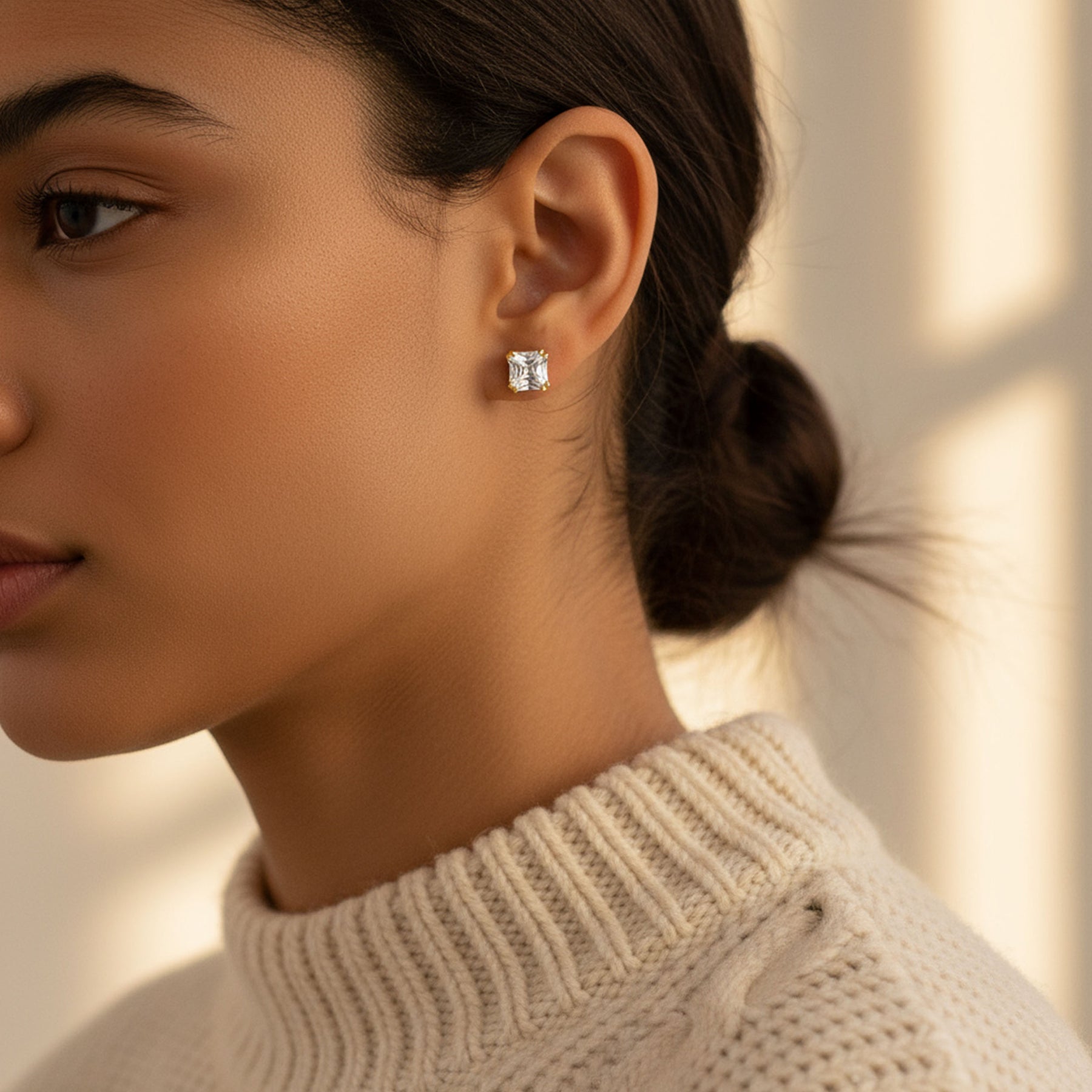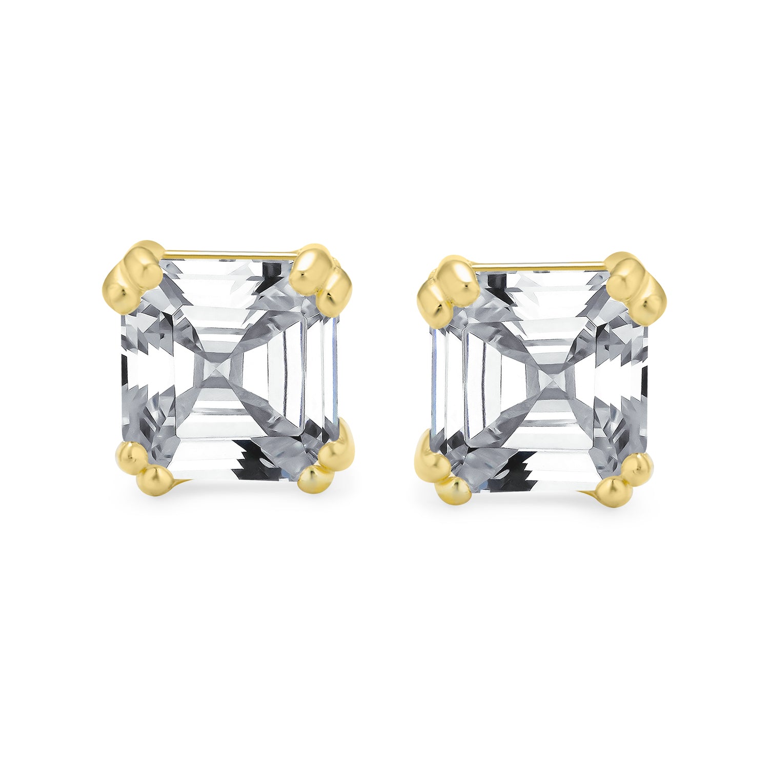 - Introducing our stylish and elegant CZ Gold Plated Asscher Cut stud earrings. You will shine in the spotlight with these pair of bedazzling yet inexpensive asscher cut stud earrings. A remarkable combination of .925 sterling silver and gleaming Gold Plated, these magnificent yet affordable unisex stud earrings sparkle with an asscher cut 5mm square shaped clear cubic zirconia stone set in the center in a classic 4 prong open setting. These chic yet affordable Gold Plated CZ earrings are fashionable, and have a stud push back closure for maximum functionality. Gorgeous with any outfit, these fabulous pair of square stud earrings is a great look for men, and makes the perfect gift for anyone on your holiday list.