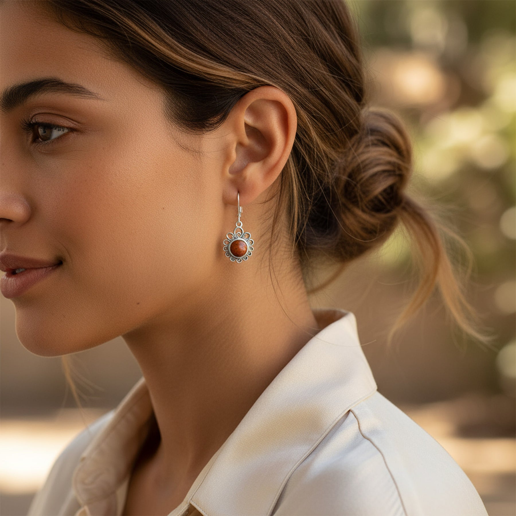 - These dainty lever back earrings feature a starburst pattern, radiating joy. With an Aztec jewelry style, worship the sun year-round. Crafted from gleaming 925 sterling silver filigree, they are beautiful. These antique-style earrings promise stylish days. Note: Natural stones may vary slightly in color.