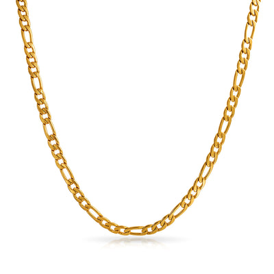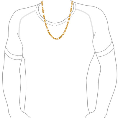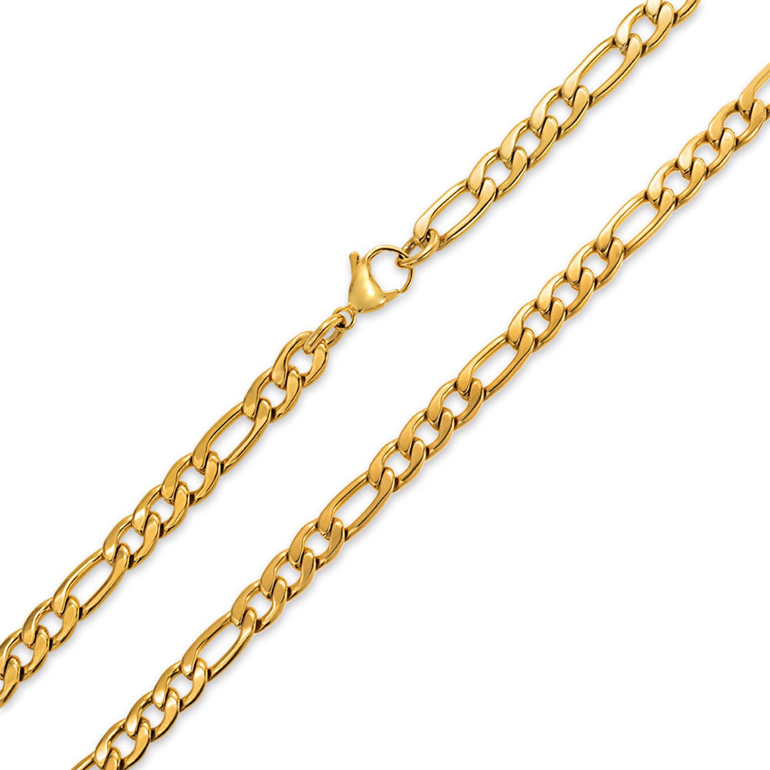 • This sleek Stainless Steel Figaro chain will make him feel like he has the Midas touch. Made from Stainless Steel, this men's neck chain has been gold plated using Ion plating technology, a state of the art plating technique that makes metals extremely resistant to abrasion. These men's gold chains have a lobster claw clasp that will keep this item secure even he you have a very active lifestyle. Stainless Steel jewelry is both durable and versatile and with its 7mm width, this Figaro link chain is ideal for any outfit. Gold chain necklaces have a classic appeal, and with their unisex style, these Stainless Steel chains are perfect for anyone on your gift lists.
