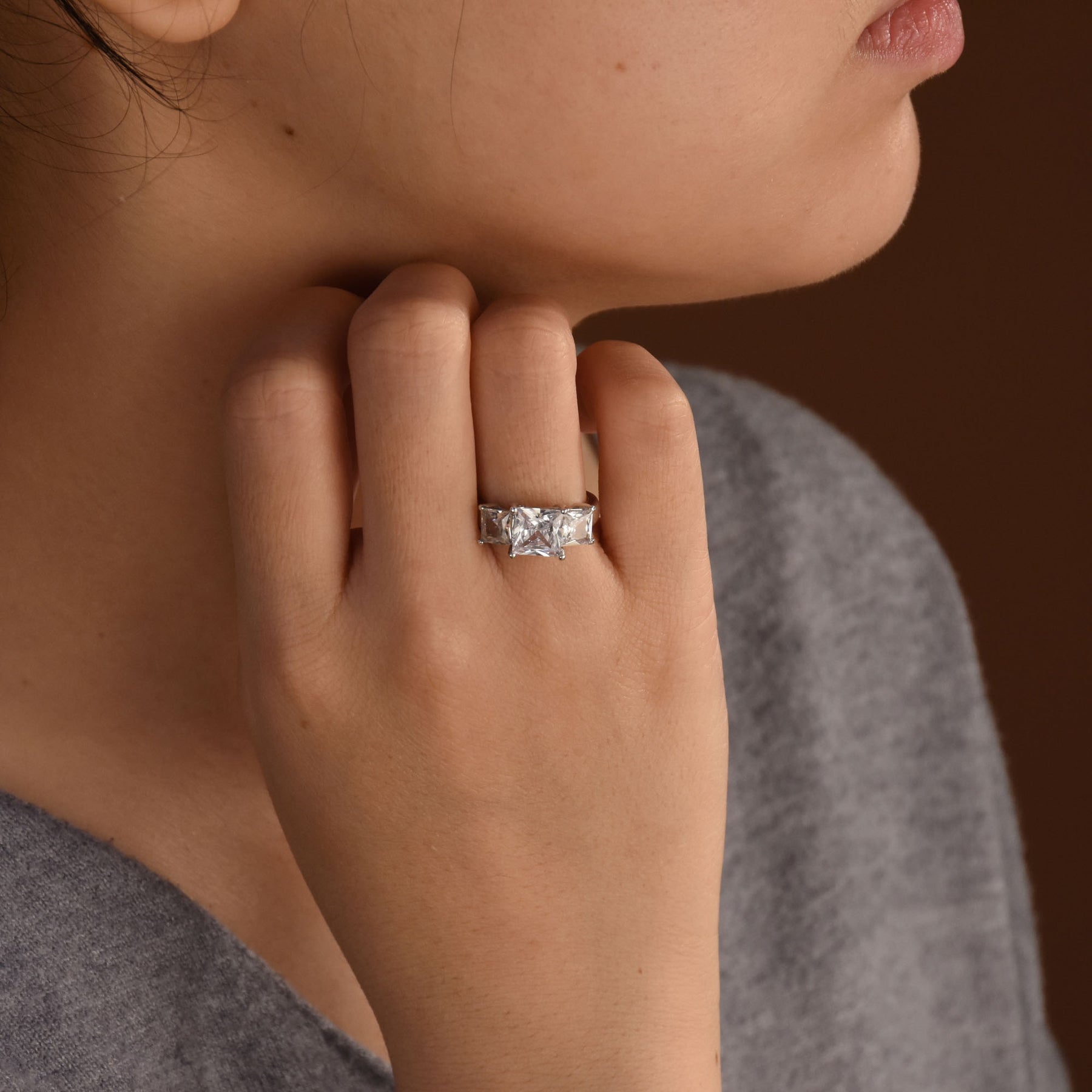 - This classic .925 Sterling Silver engagement ring features 3 brilliant princess cut CZs in a 4-prong setting. The stunning 2-carat CZ center stone is flanked by 0.75-carat CZs on each side. Each stone symbolizes the past, present, and future of your relationship. Perfect as a promise ring, it captures cherished memories and future dreams. Celebrate your love with this timeless, elegant engagement ring.