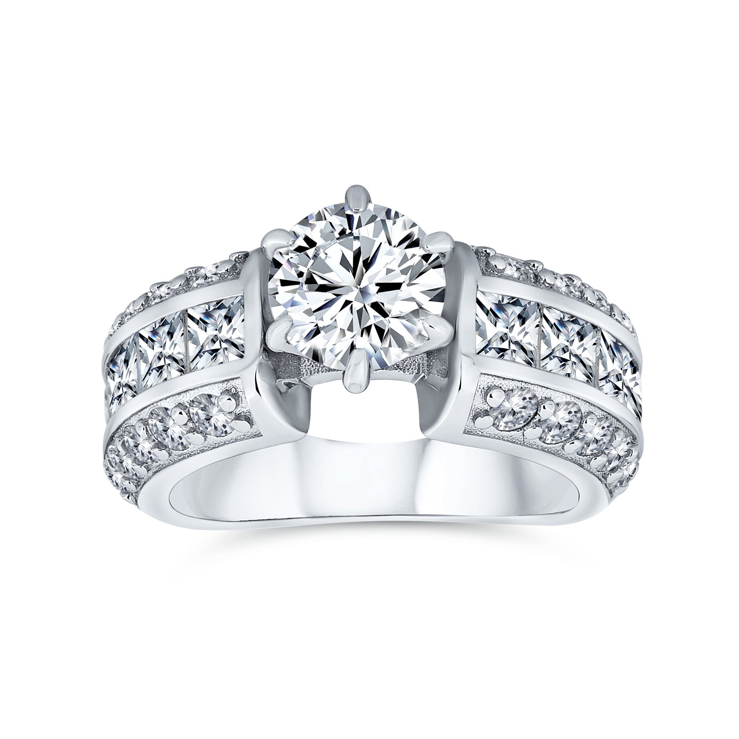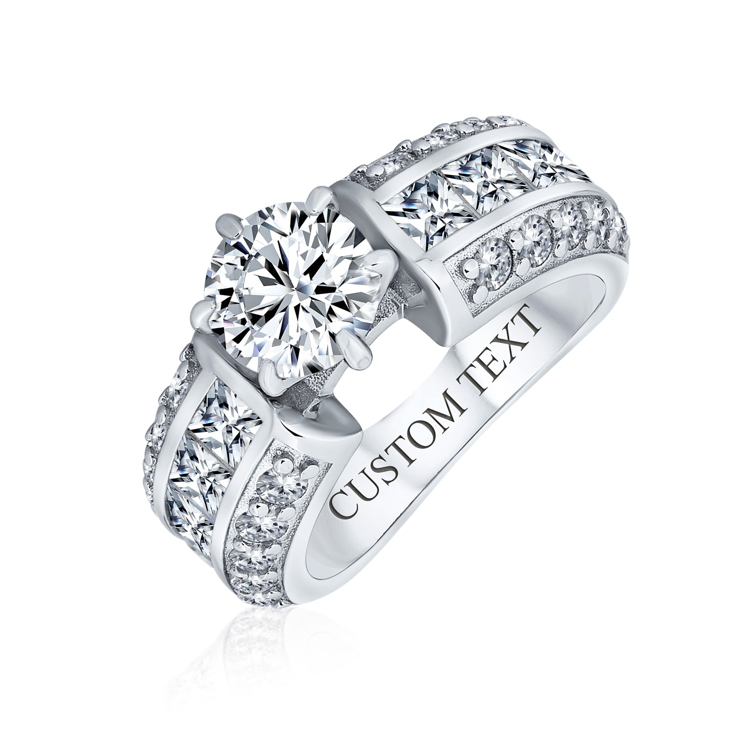 - Princess and round cut CZ engagement rings offer sparkle and style. Sterling silver band features 3 rows of stones. Centerpiece is a sparkling round cut stone, flanked by pave stones. This stunning cz jewelry will wow her into saying yes. Order today and pop the question.