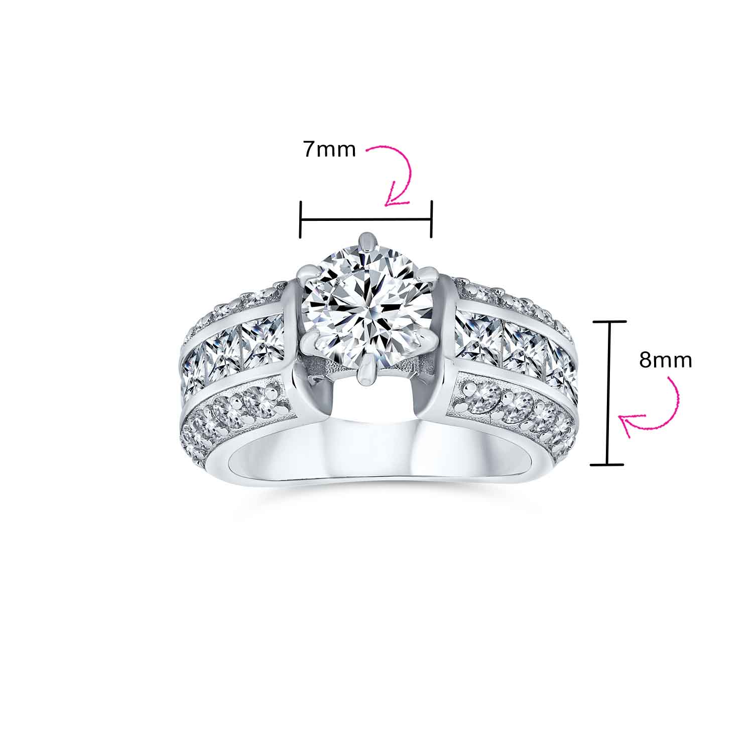 - CONTEMPORARY ELEGANCE - Captivate your beloved with this stunning wide band engagement ring. Featuring a brilliant round cut CZ stone at the center, flanked by three rows of sparkling pave and princess cut CZ stones on each side. Size 8 ring.