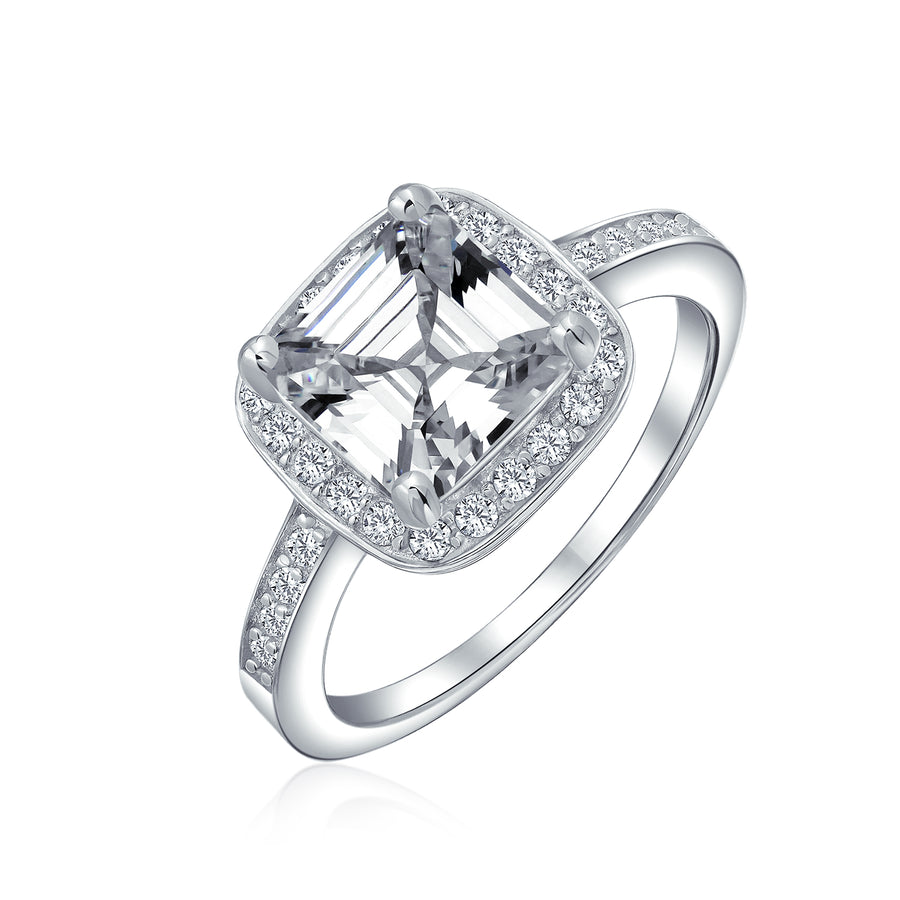 - HALO STYLE - Enchant your beloved with this radiantly sublime sterling silver fashion engagement ring featuring a flawlessly lustrous Asscher cut square cz stone accented with sparkling channel cut pave czs.