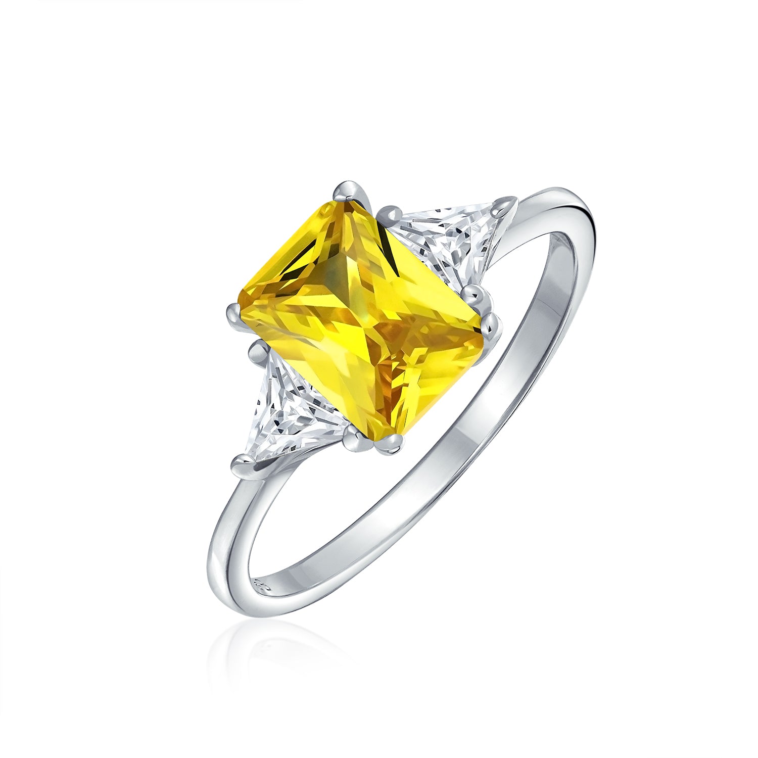 - Make your sweetheart shine with joy by gifting her this stunning 3-stone engagement ring, showcasing an emerald-cut canary yellow CZ flanked by two radiant trillion-cut CZs, all set on a shimmering .925 sterling silver band.