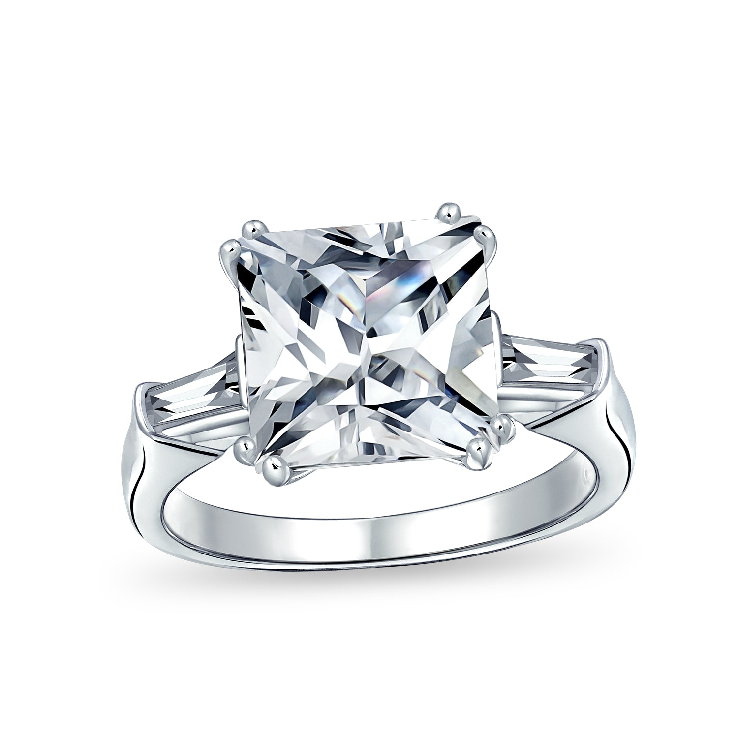 - Show your love for your fiancé with this elegant 3-stone engagement ring, featuring a stunning 4.5 CT Asscher cut CZ center stone, flanked by two brilliant baguette CZs on a beautiful .925 sterling silver band.