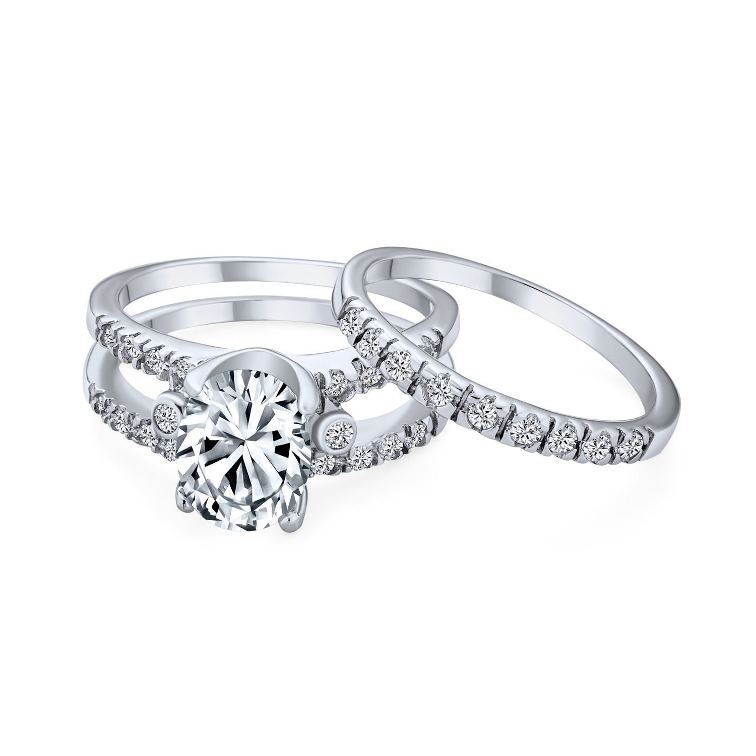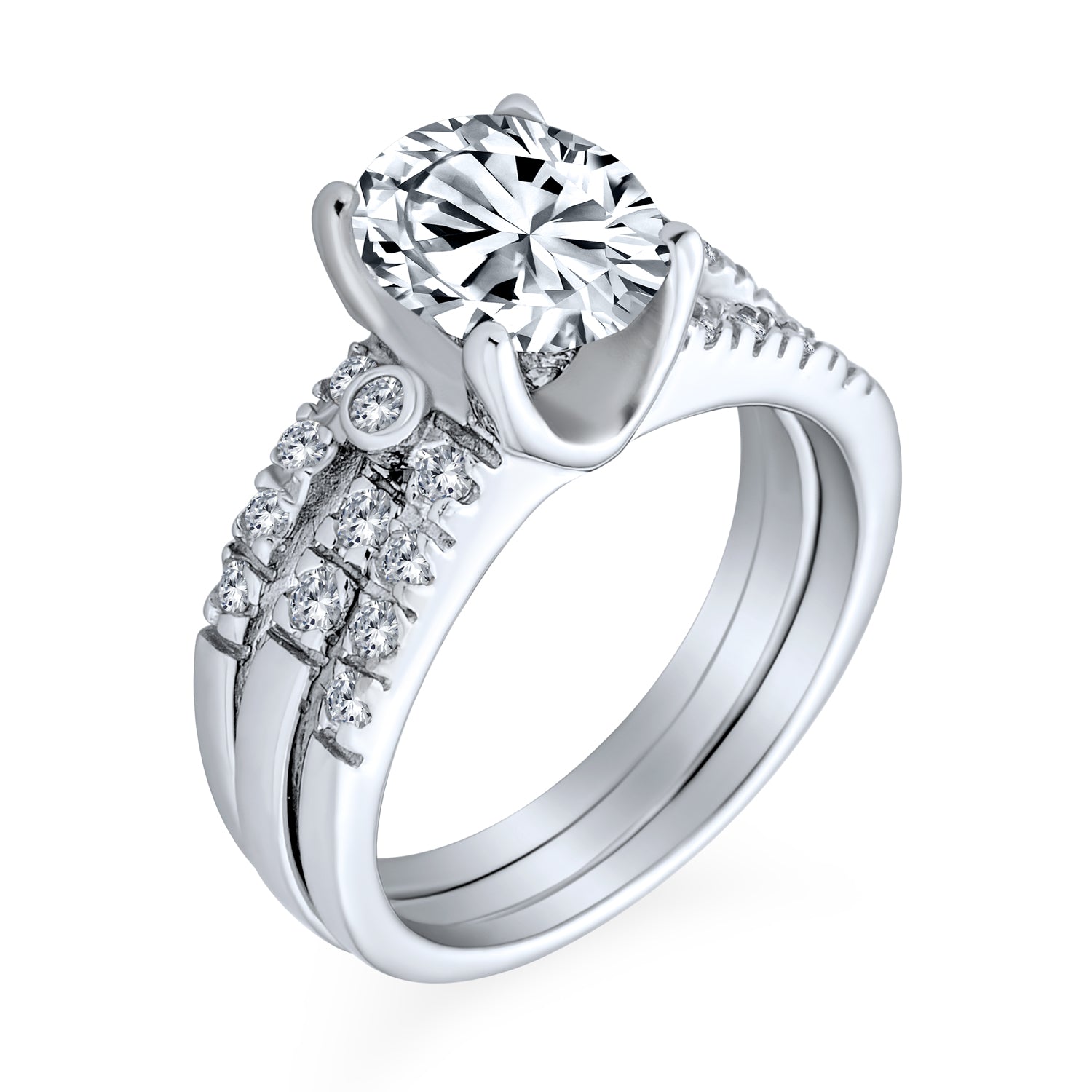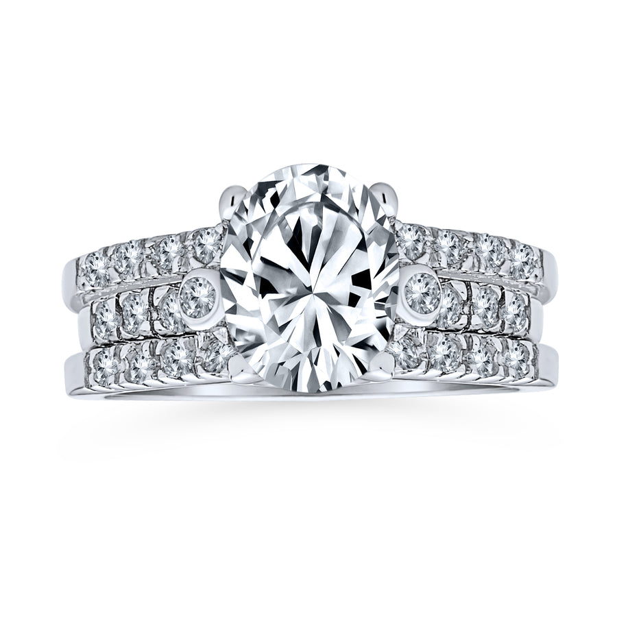 • Our glam oval wedding engagement ring guard set is a dream in sterling silver. Featuring a 2.5ct CZ solitaire and pave CZ sparkle. Rhodium plated bridal rings with a pave encrusted eternity band. Wear solo or as a statement ring.