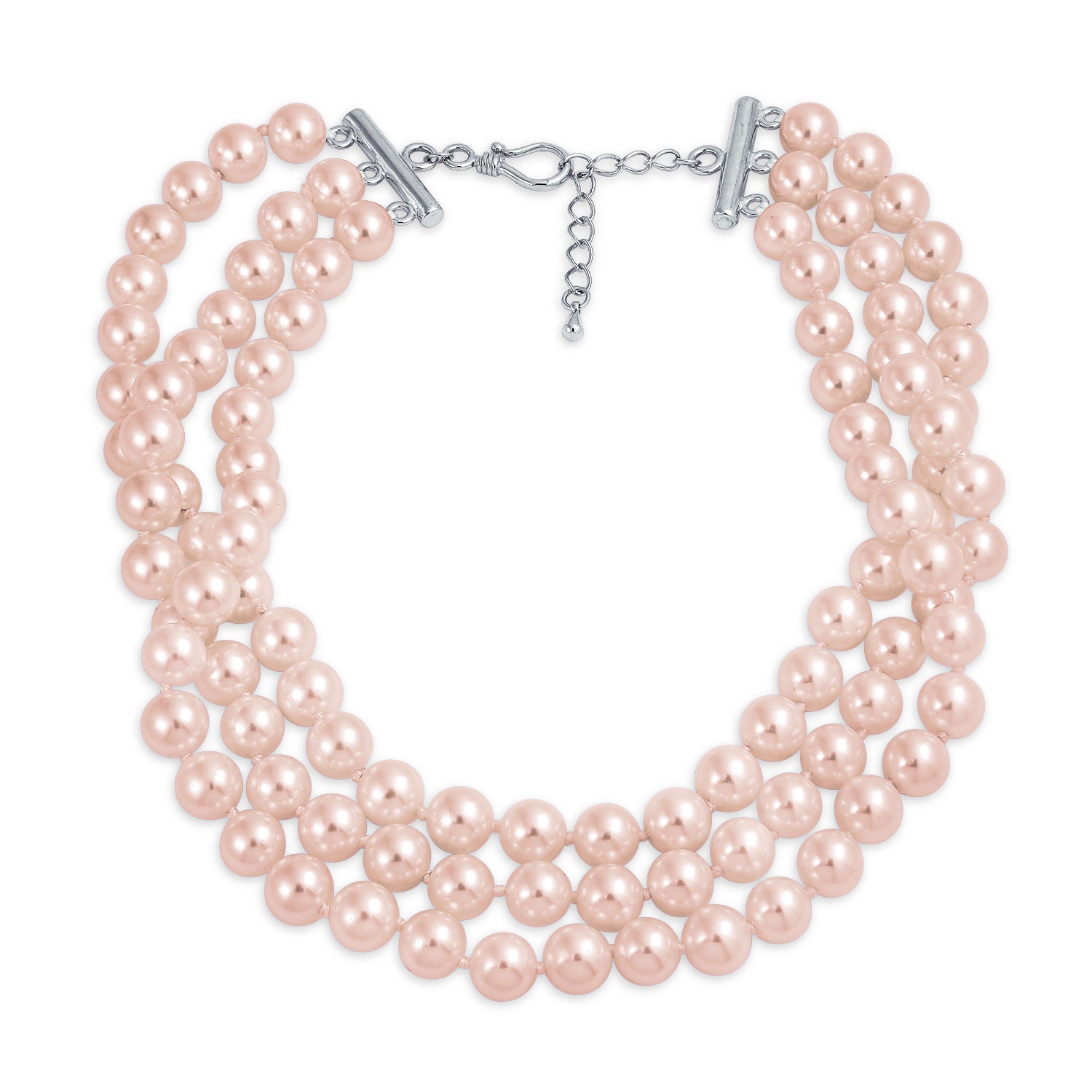 - Showcase your impeccable taste with our elegant three-strand Simulated Pearl choker necklace. Simulated pearls have never been more fashionable. This stunning multi-strand necklace will turn heads. Crafted with fine quality 8mm simulated pearls and a durable alloy. The 13-inch necklace includes a 2-inch extender and rhodium plating to resist tarnish. Three strands of shimmering beauty highlight your collarbone, giving you a radiant look. Perfect for weddings, this affordable bridal jewelry makes a cherished gift for your bridal party and the mother of the bride.