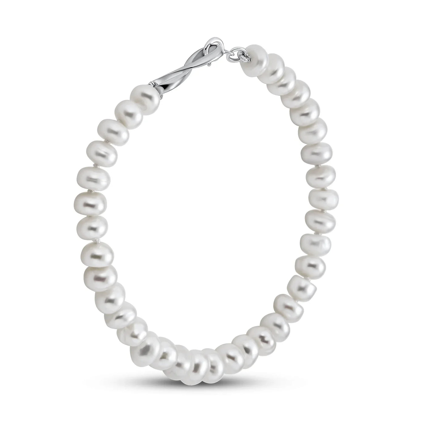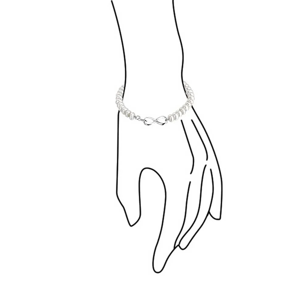 - Exuding femininity and romance, this stunning strand bracelet will add classic beauty to your bridal or formal ensemble. Featuring glowing, white, 6mm freshwater button pearls with an infinity, figure 8 design at center.