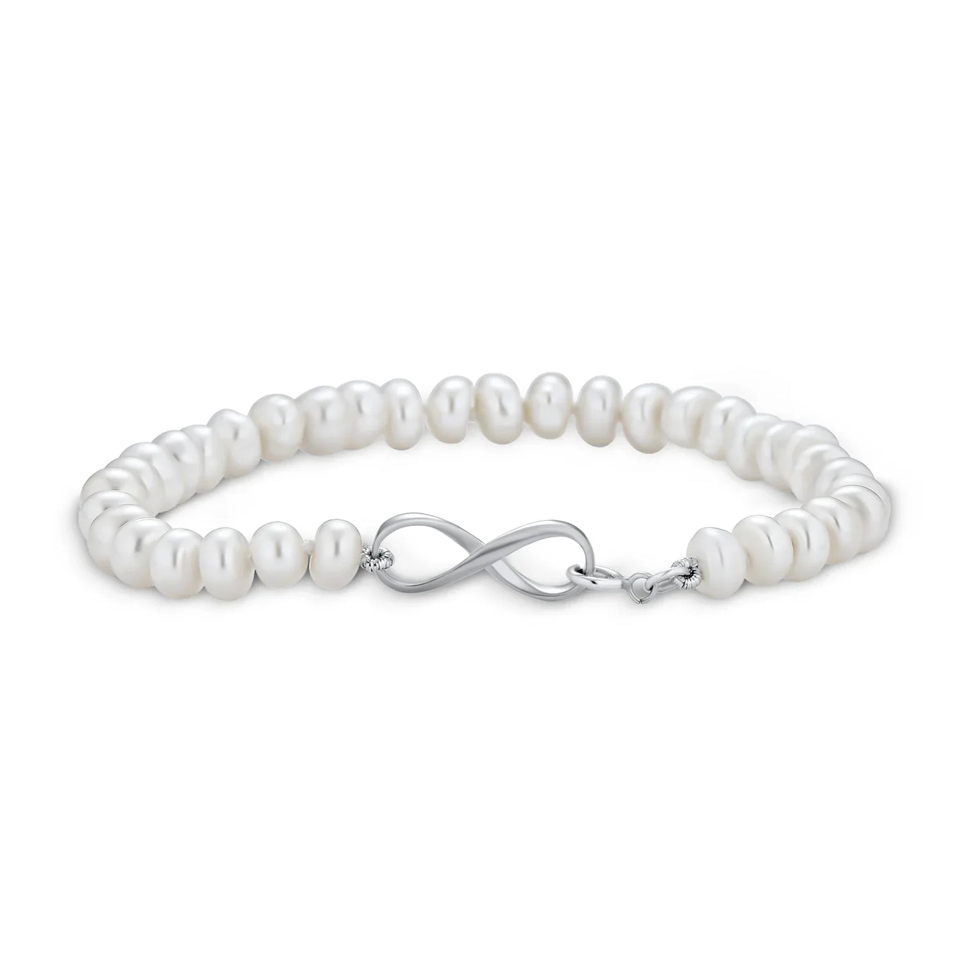 - Our stunning strand bracelet features thirty-eight 6mm button-shaped freshwater cultured pearls. This elegant freshwater pearl bracelet includes an Infinity symbol charm with a spring ring clasp. Wear this glamorous and sophisticated Infinity bracelet to elevate any outfit.