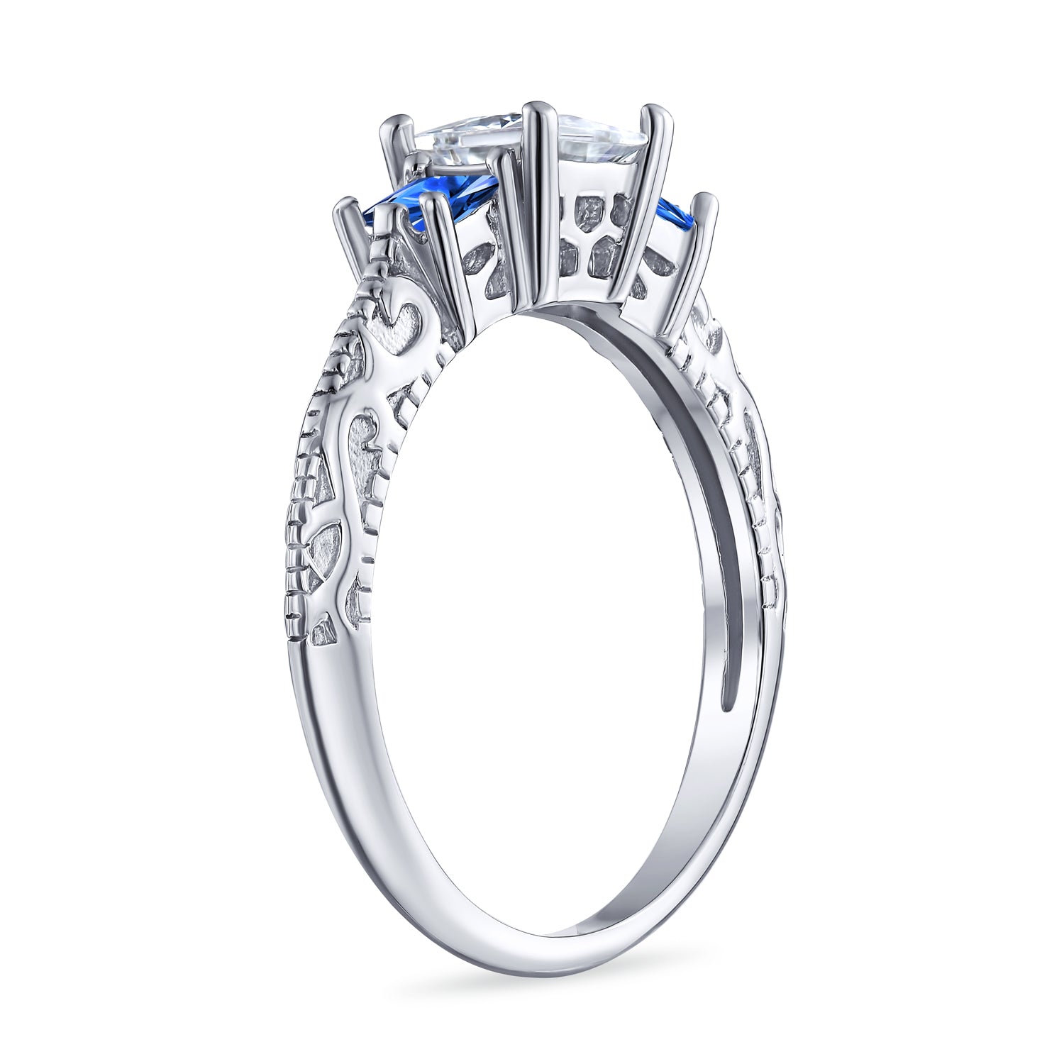 - ELEGANT DESIGN - Captivate your future bride with this exquisite art deco engagement ring, featuring a three-stone arrangement with princess-cut clear and simulated sapphire CZs. The milgrain filigree 925 silver band adds a touch of sophistication. Size 5 ring.