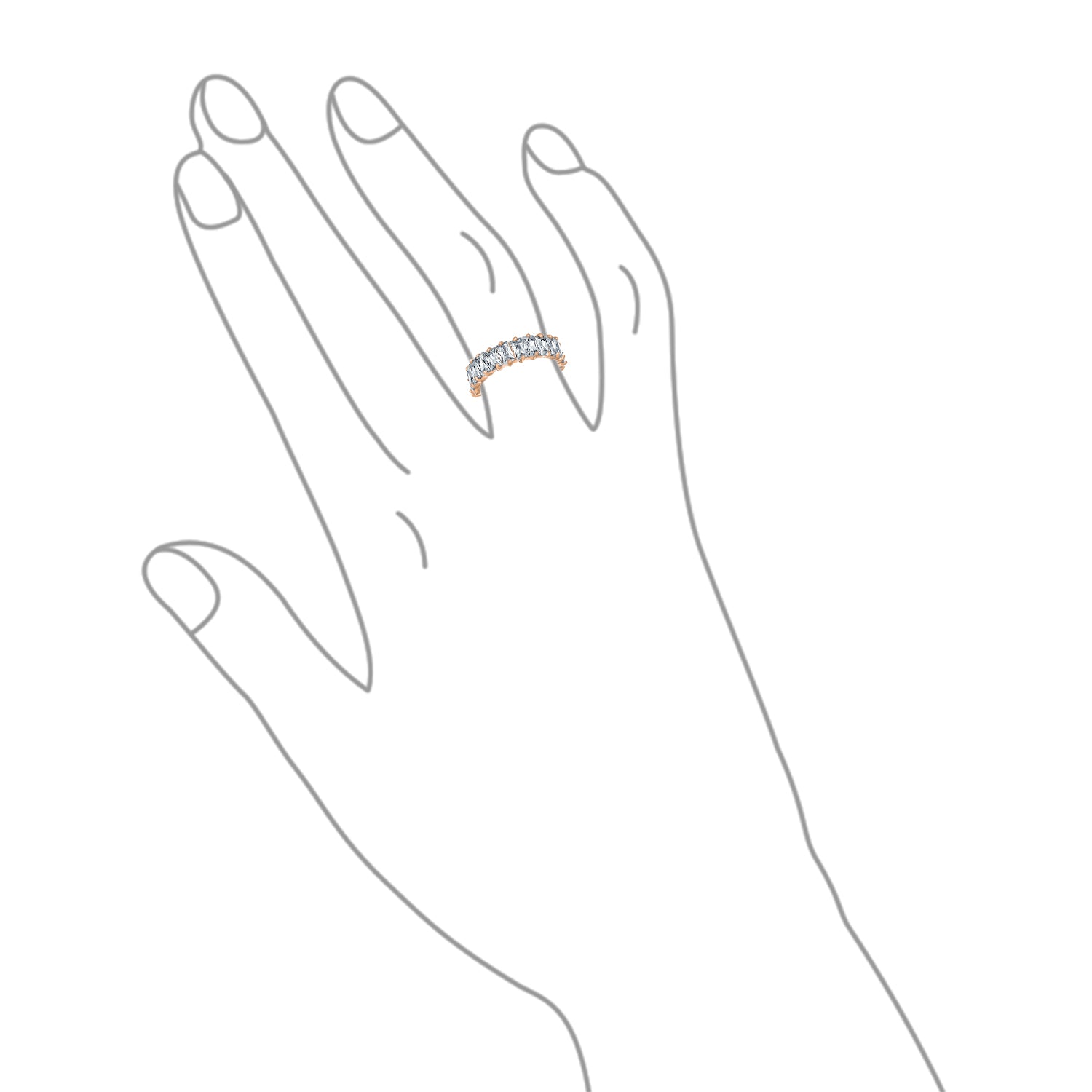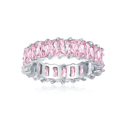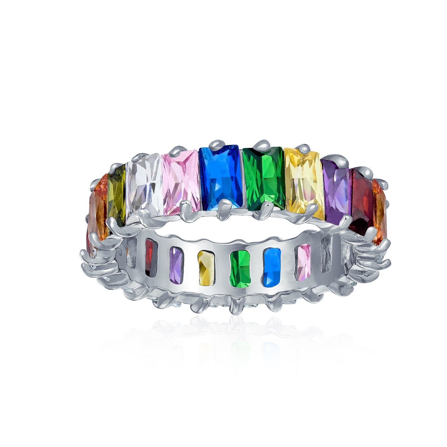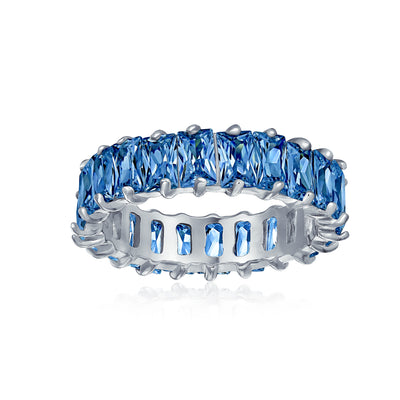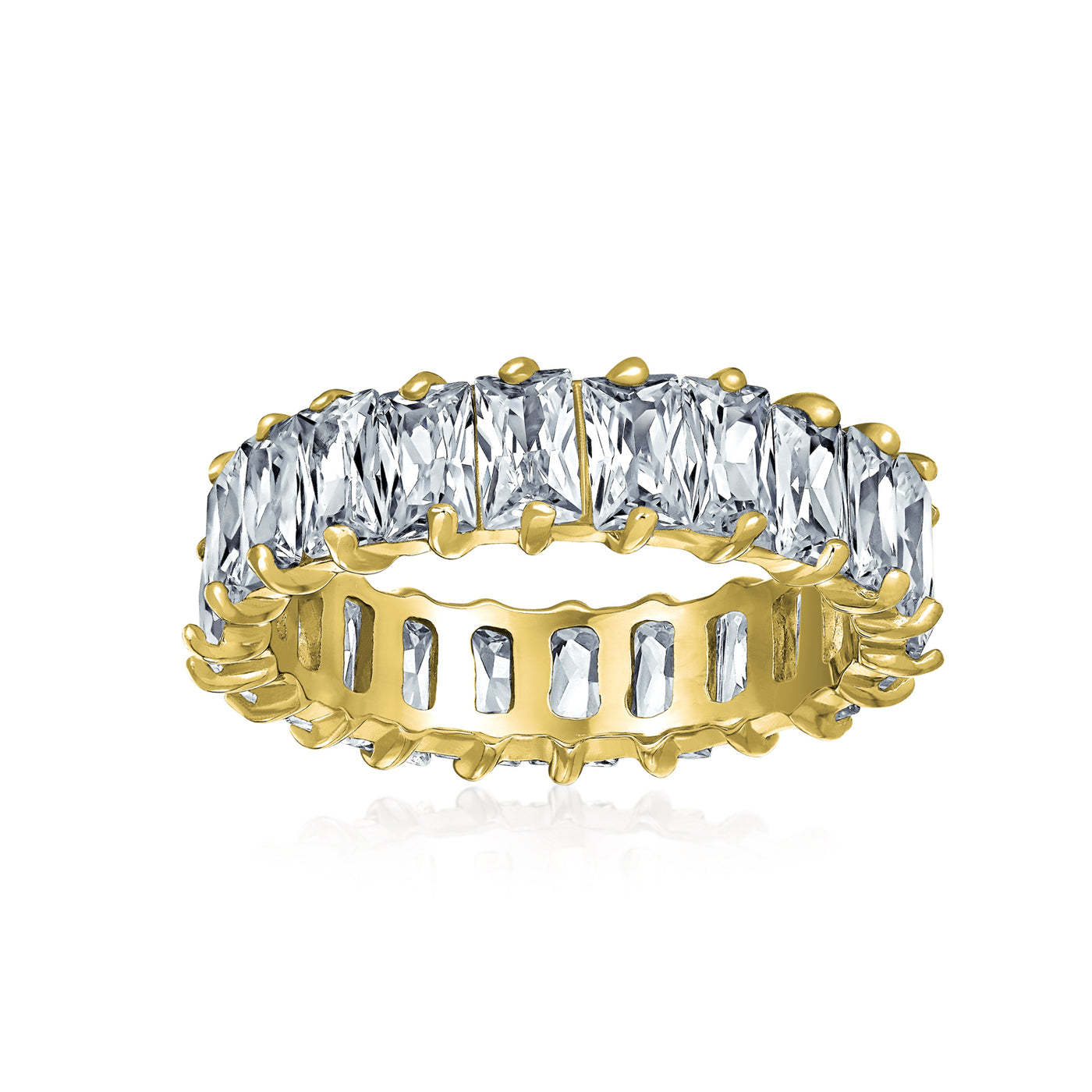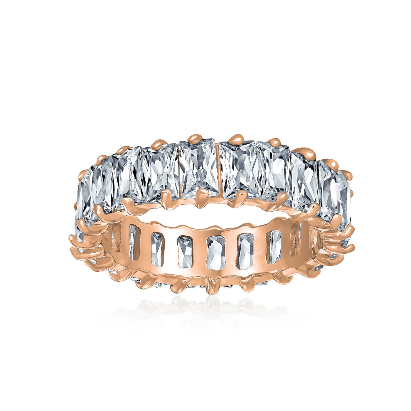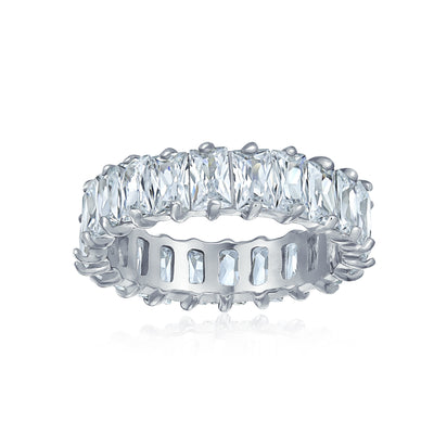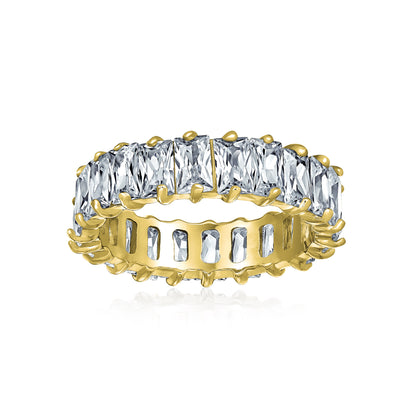 - Timeless and sophisticated stackable eternity band ring featuring a 4-prong setting with faceted baguette emerald-cut cubic zirconia.