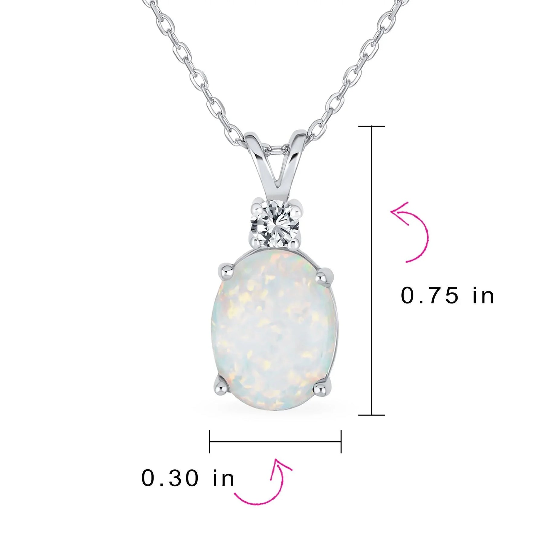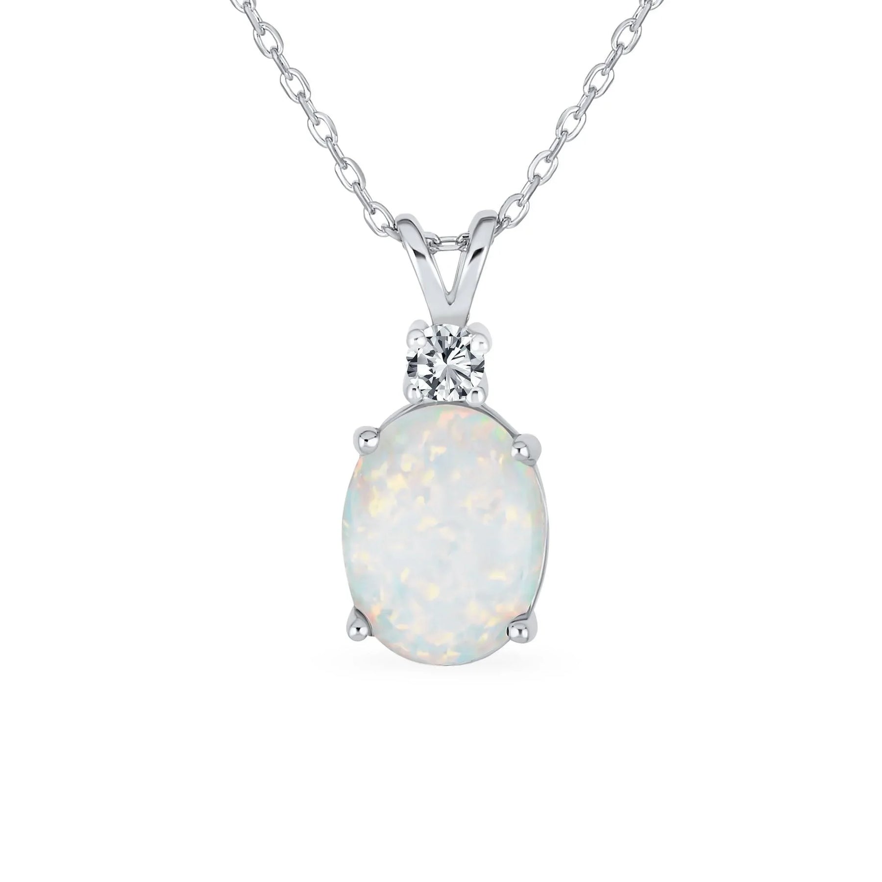 • A classic Created White Oval Opal necklace is perfect for October birthdays. Ideal gift to add sparkle to any wardrobe. This .925 Sterling Silver Created Opal necklace is stunning. The 4 prong setting is rhodium plated to prevent tarnish. Order an affordable Created White Opal oval pendant today. rolo chain INCLUDED.