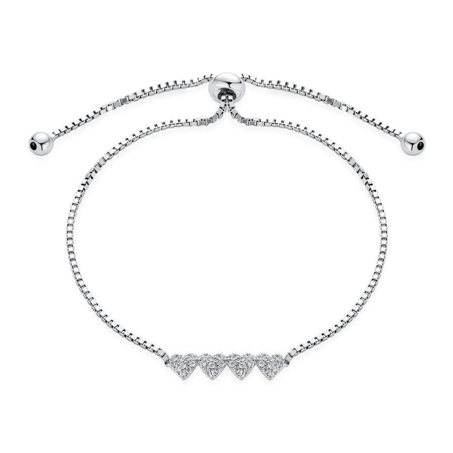 - Discover a modern twist on the classic wedding bracelet. This adjustable bracelet features four sparkling cubic zirconia hearts. The box chain offers a contemporary, clean look. Lariat styling with a silver-tone bead ensures a secure fit. Adjustable from 7 to 10 inches to fit any wrist. Perfect for diamond lovers!