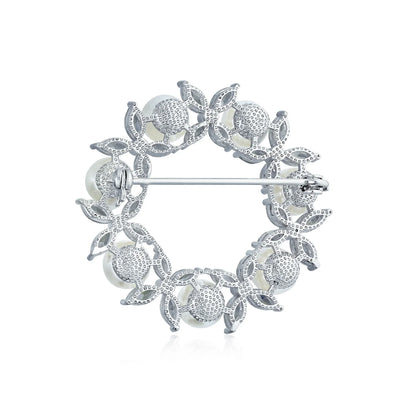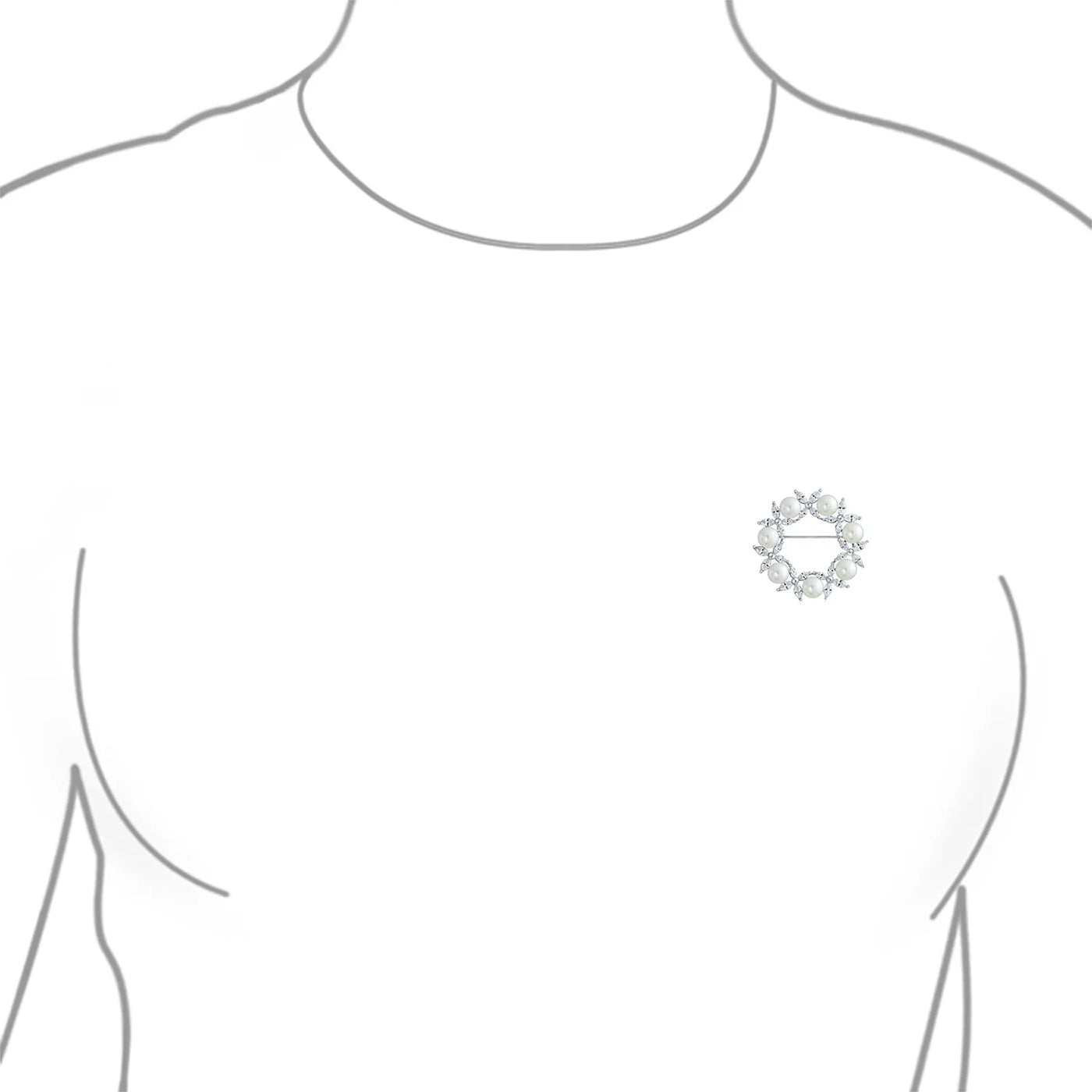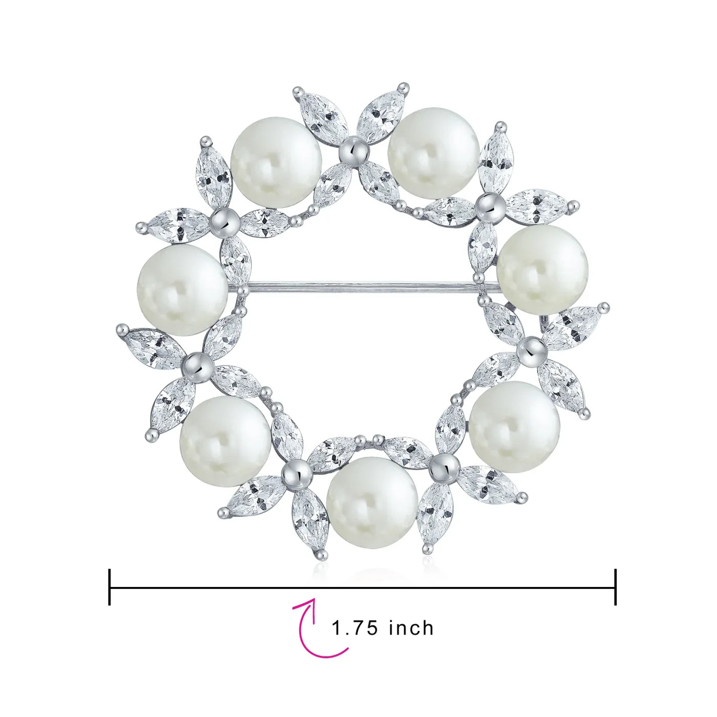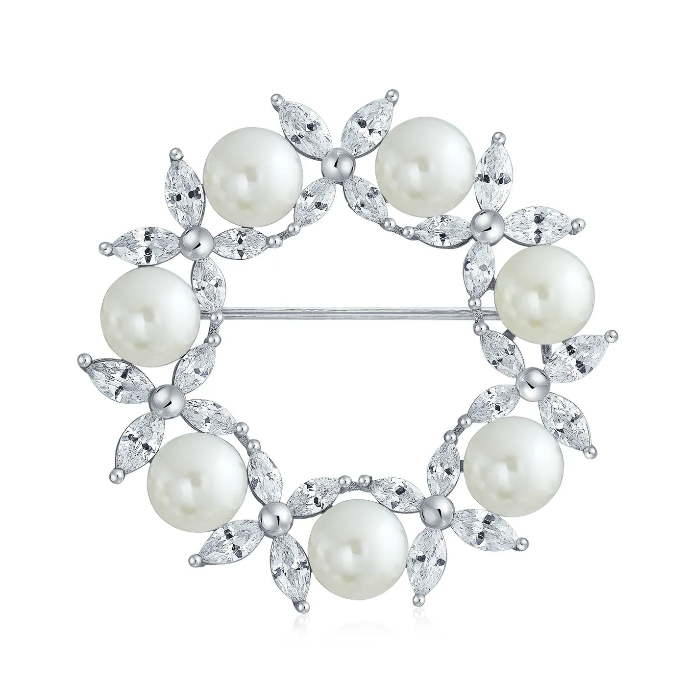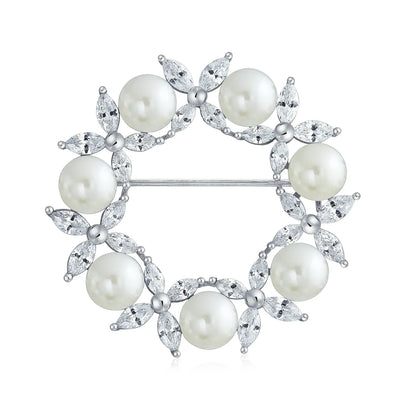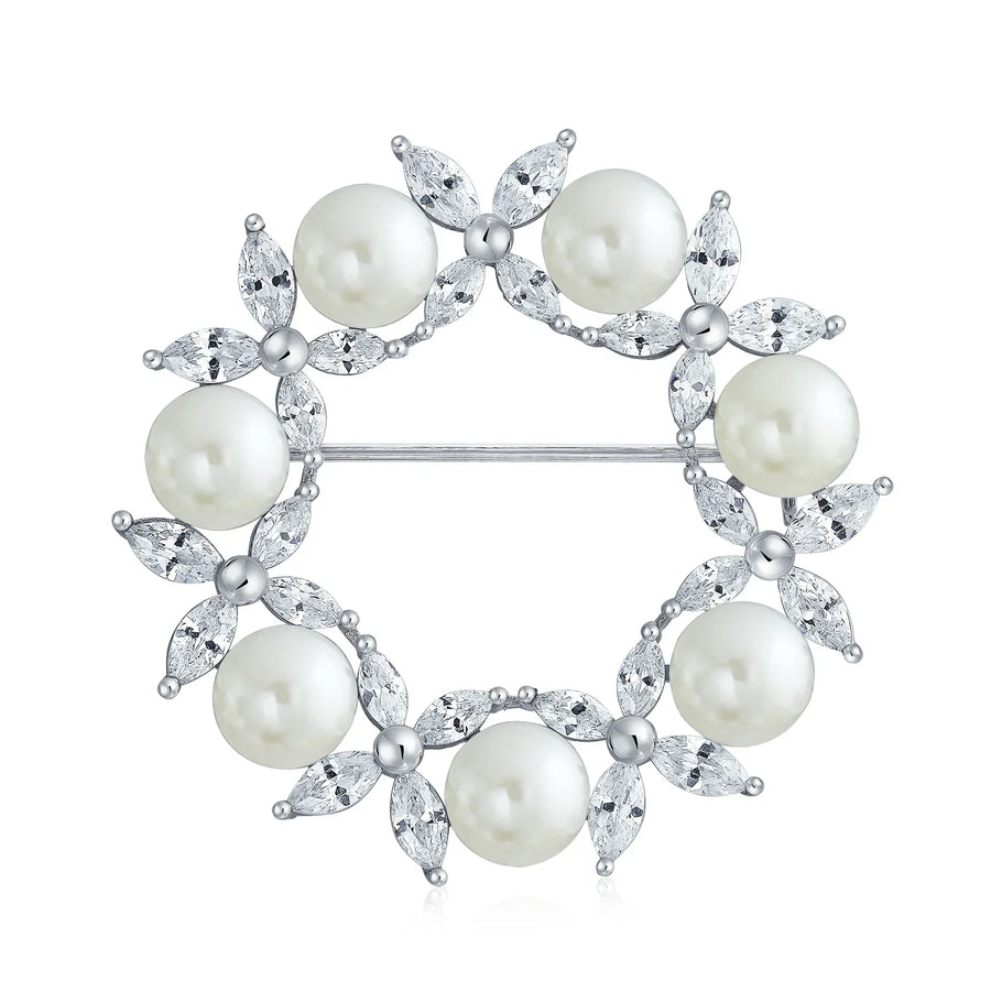- From our living jewelry collection, this rhodium-plated brass flower pin offers a tarnish-resistant shine. The exquisite brooch features 7 round white Simulated Pearls. Sparkling marquise cubic zirconia stones form a flower pattern between the pearls. This silver-toned CZ Brooch Pin has a stunning look. Perfect for showcasing refined taste at spring bridal parties and weddings.