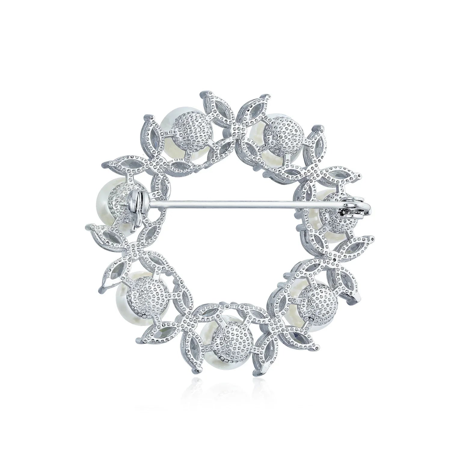 - Material: Rhodium Plated Alloy, Simulated Pearls, Cubic Zirconia Measure: 1.75 inch L x 1.75 inch W, Weight: 14 grams, High luster simulated pearls. Circle style with hinged clasp