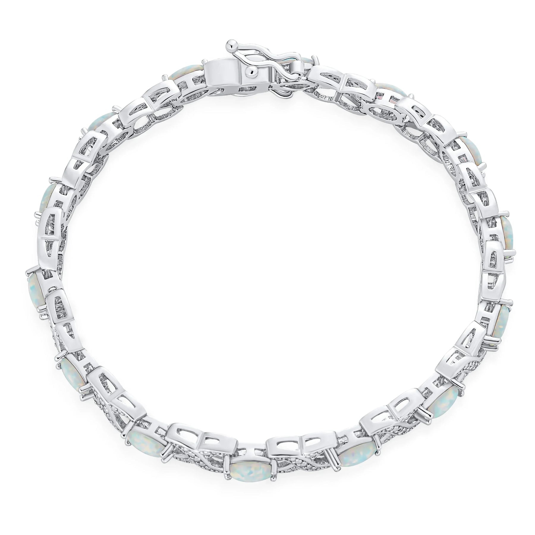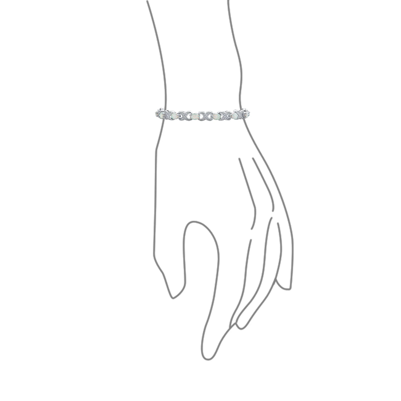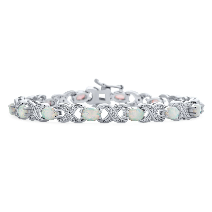 - Discover our stunning Created Opal Jewelry Collection. This elegant tennis bracelet features chic Created Opal gemstones set in .925 sterling silver. Created Opals symbolize loyalty, faithfulness, and protection. Twelve oval-cut white Created Opals are secured in four-prong settings. The XO hugs and kisses link design adds a romantic touch. Each gemstone measures 4mm x 6mm. Rhodium finish enhances luster and shine. A perfect gift for a sophisticated woman. The tongue snap closure with safety wings ensures security. Fits an 8-inch wrist. Ideal for infinity jewelry lovers.