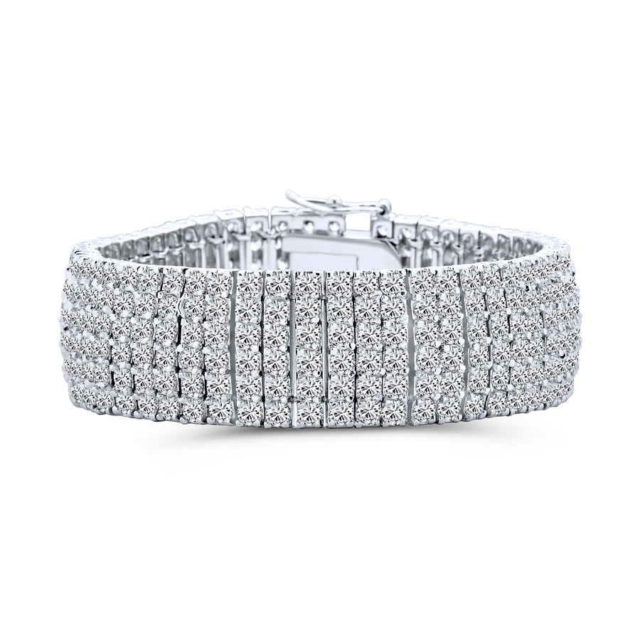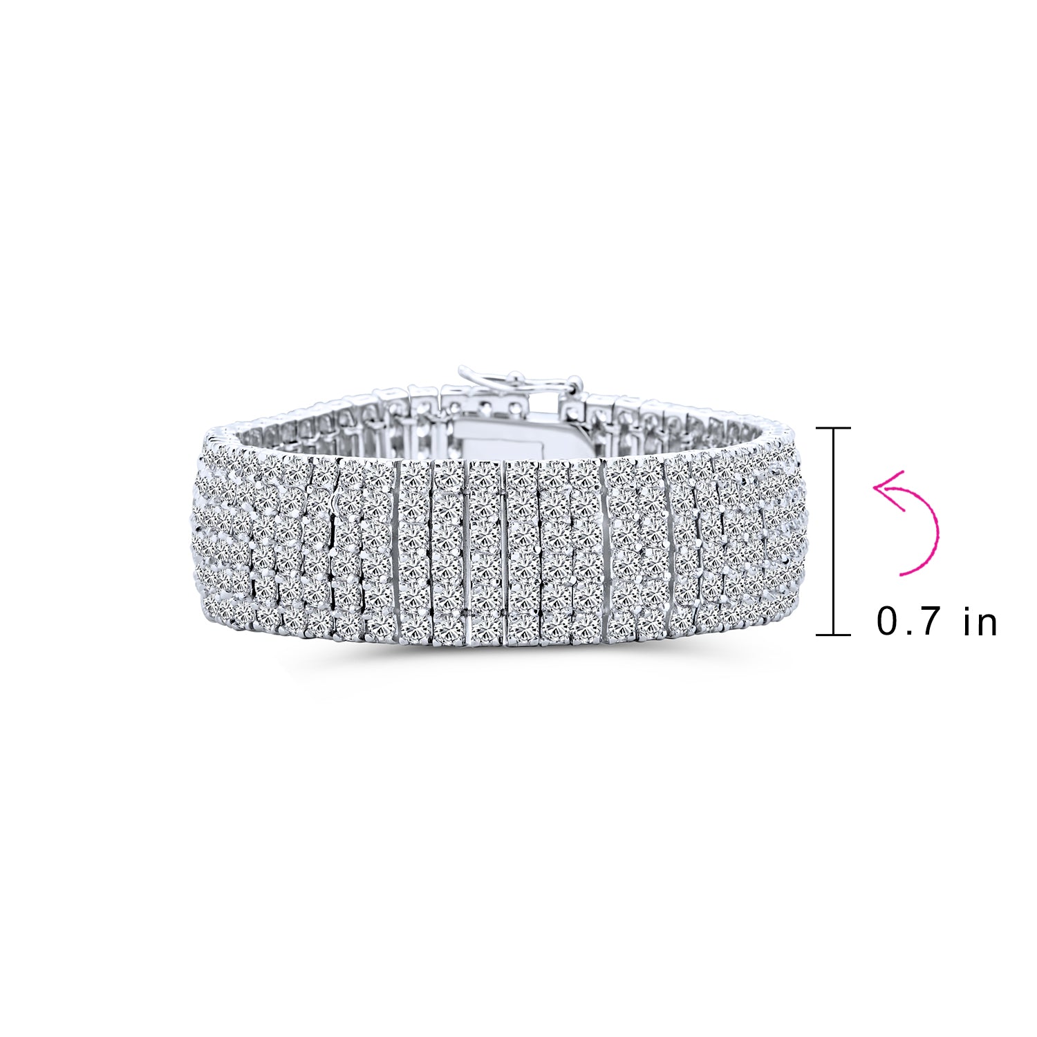 - Elevate your style with a touch of Hollywood glamour and vintage charm by adorning yourself with this stunning statement tennis bracelet. Perfect for weddings or formal occasions, this exquisite piece showcases a wide bracelet adorned with six rows of shimmering, clear cubic zirconia stones. Its design is reminiscent of the opulent Gatsby era, making it the perfect accessory to shine on the red carpet.