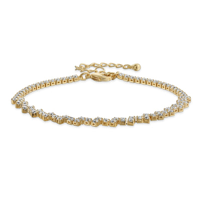 • Material: Cubic Zirconia, Yellow Gold Plated Brass, HYPOALLERGENIC - Lead free Nickle-free. Measure: Fits 7-8 Inch wrist 7 inch L with 2 Inch Extender x 0.15 inch W, Weight 3.5 grams. Stone: 2 mm W, Weight: 1.3 Grams