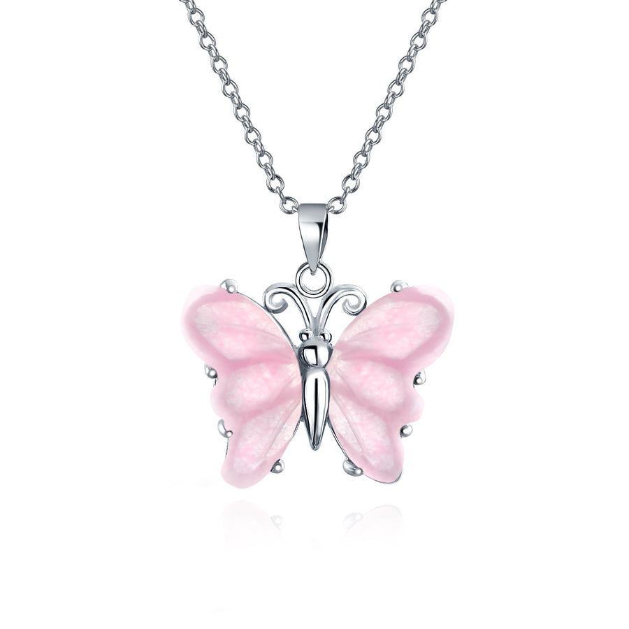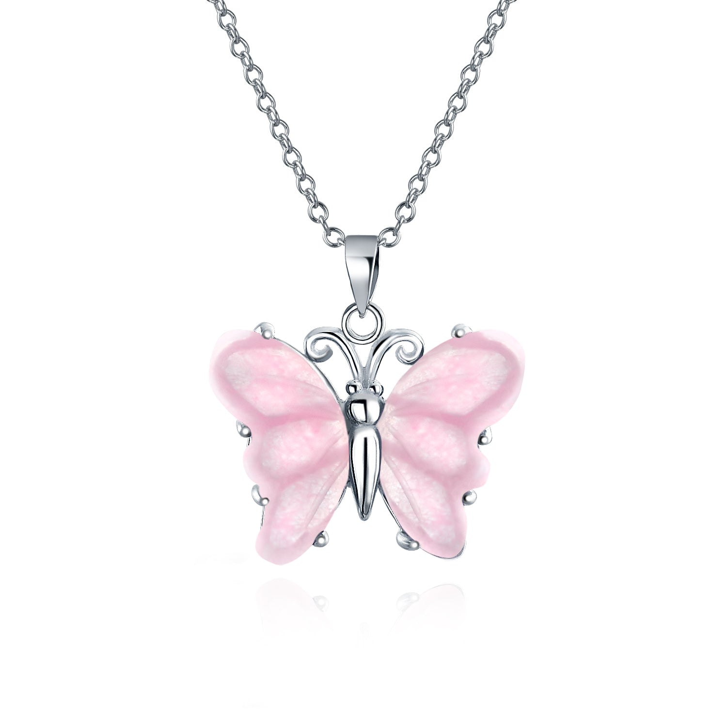 • Soft pale pink Quartz, cherished for centuries, restores harmony and balance. This pendant necklace features a light pink butterfly motif, infusing your style with positive, healing energy and free-spirited appeal.